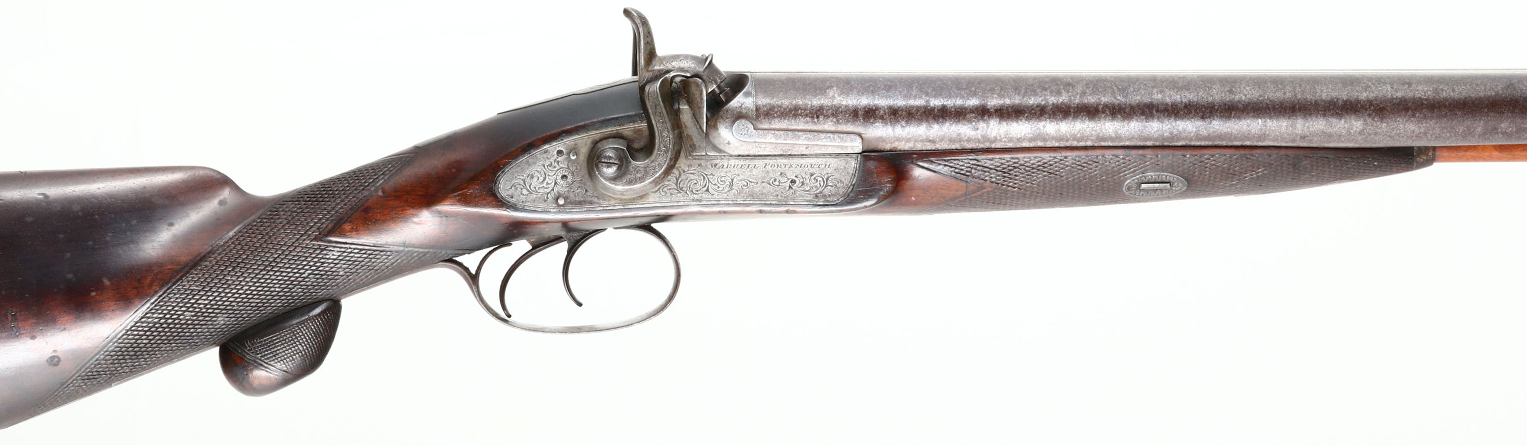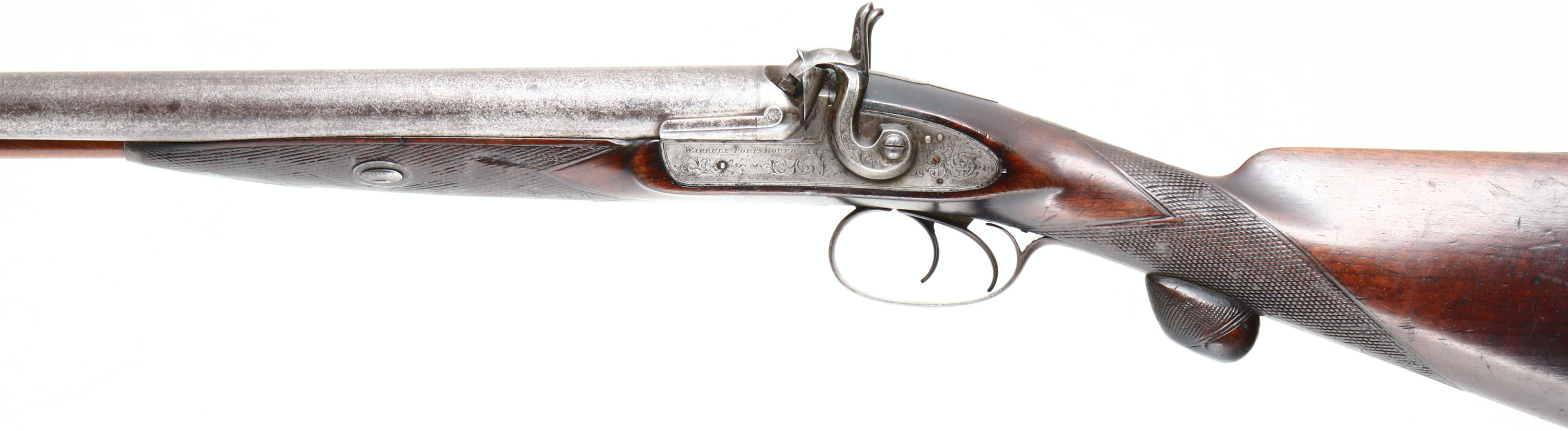 Warrell Portsmouth, Muzzleloader Shotgun, CAL: 8 Bore, MFG: circa 1830-1840, SN: NSN, SxS Muzzleloading Shotgun, 31 1/4'' barrel. The solid rib is marked ''S.WARRELL PORTSMOUTH'' & both side plates are marked ''WARRELL PORTSMOUTH''. The original, checkered straight grip wood stock is excellent. There are contusions, scratches, scrapes & dings. Protective oils have been added over time contributing to some darker areas. The straight grip has an original checkered palm rest & there is a blank silver square initial plate on the top of the wrist. The metal is slightly proud to the wood at most points of contact. The metal finish has worn to metal grey & toned to a brown patina, with consistent spotting & speckling throughout. The receiver, upper tang, hammers, barrel end, trigger guard, forend metal components & buttplate all display beautiful floral scroll engraving. Bores are very good for such an early black powder shotgun, they are consistently rough, with some intermittent pitting. The solid rib holds a single front bead. Stock carries a smooth metal decorative buttplate. Double triggers. Overall this very early muzzleloader presents very well & would be a nice addition to a shotgun collection. Antique, No FFL Req. - Value: 1400 to 2800