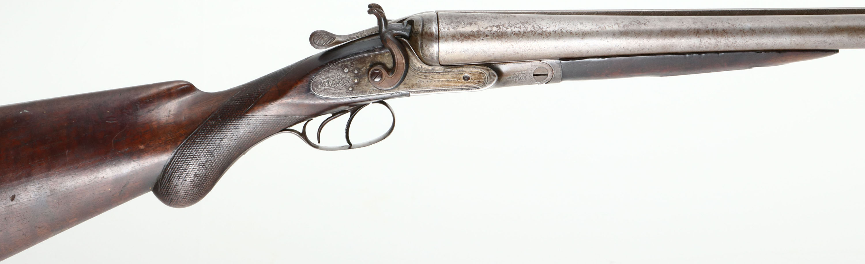 Charles Daly, Hammer Double, CAL: 8 Bore, MFG: Late 19th Century, SN: 2580, Break Action SxS Shotgun, 33'' barrels. The side plates are marked ''CHARLES DALY'' & the rib is marked ''CHALES DALY FINE DAMASCUS BARRELS''. All matching SN on the trigger guard, forend, floor plate & water table. The original, checkered round knob wood stock & forend are very good & solid. There is a crack on the left side of the stock, above the trigger guard, some popped grains on the buttstock, along with contusions, scrapes & dings. The forend has been sanded & refinished, but the buttstock appears untouched. The damascus barrels have worn to metal grey, with a thin brown patina. There's intermittent spotting & the Damascus thumbprint pattern is still easily visible. The receiver has worn to metal grey & toned to a brown patina, with consistent spotting & speckling. It may have been case-hardened, but there are no remnants or case-colors remaining. The receiver, barrel ends, break lever, trigger guard & forend break lever all display simple ornamental engraving. Bores are fair, dark & rough. The solid rib holds a single front bead. Stock carries a checkered horn buttplate that's worn towards the top. Double triggers. A large bore shotgun by a well known maker. Antique, No FFL Req. - Value: 1500 to 3000