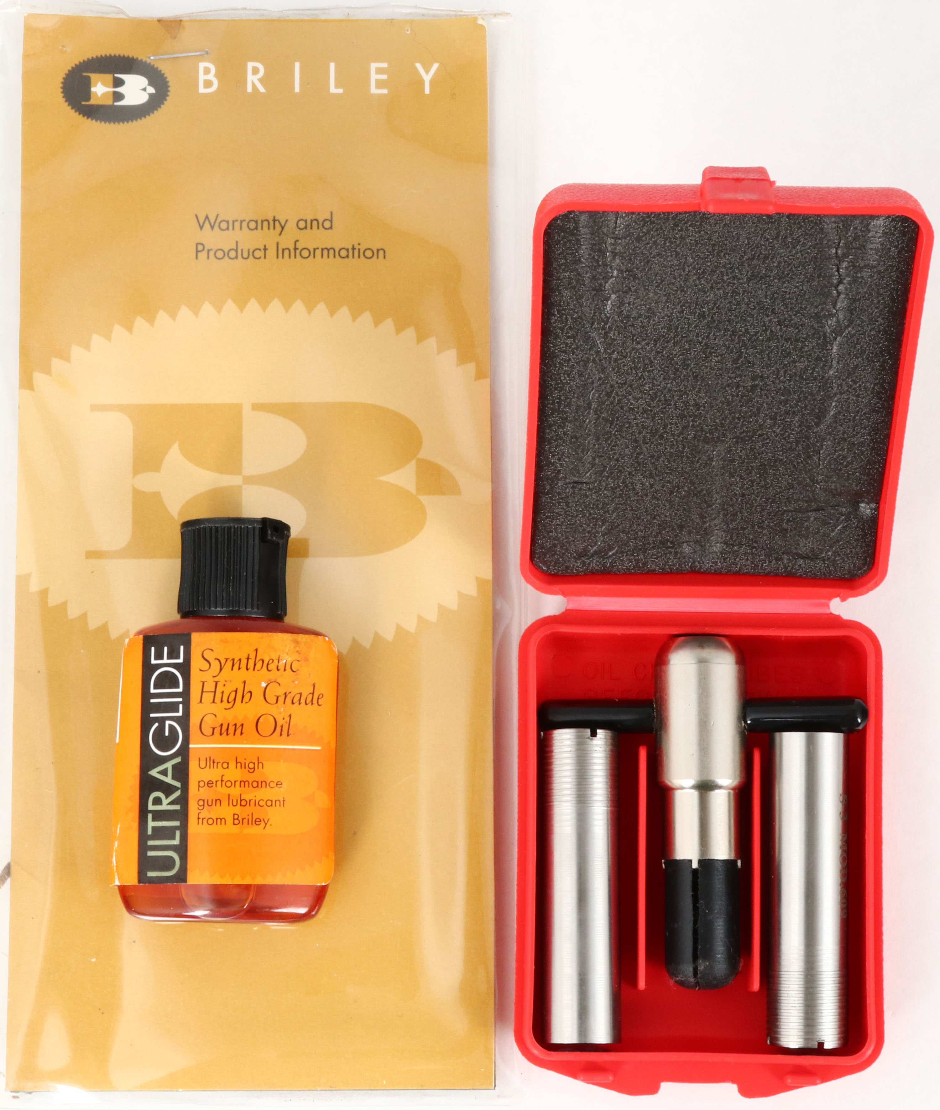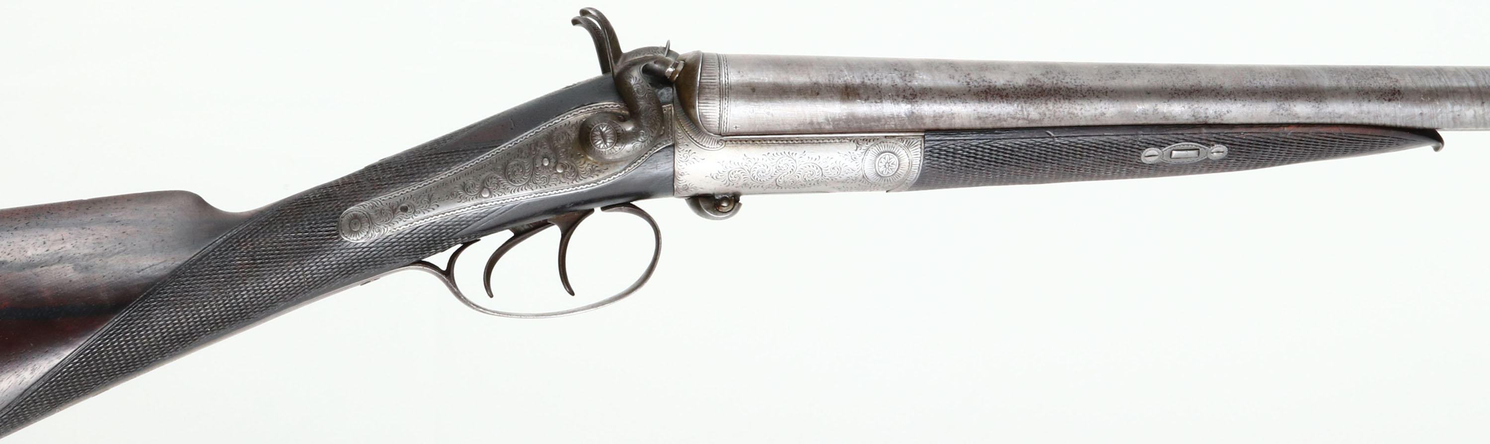J.P Clabrough & Bros, English Hammer Double, CAL: 20GA, MFG: 1871-1893, SN: 902, Side Lever Break Action Shotgun, 30'' barrels. The original checkered straight grip wood stocks are excellent & solid, having been lightly sanded, with oils added over time. The stocks have contusions, scrapes & dings. There is a blank silver shield name plate inlaid in the belly. The ''Stub Twist'' steel barrels have fully worn to gun metal grey, with areas toned to a brown patina & remnants of the original brown finish towards the muzzle. The receiver has worn to metal grey, with an aged patina. The receiver, hammers, trigger guard & forend metal components & screws are all engraved with a simple ornamental scroll pattern. Bores are excellent & bright. This rifle appears to have started it's life as a 12GA, but since has been re-lined to 20GA, with screw-in Briley Choke Tubes. The solid rib holds a single front bead. Stock carries a smooth metal buttplate. Comes with an additional set of choke tubes, tool, Briley Oil & Warranty booklet. LOP: 13 7/8'', DAH: 3 5/8'', DAC: 2 1/4''. Antique, No FFL Req. - Value: 400 to 800