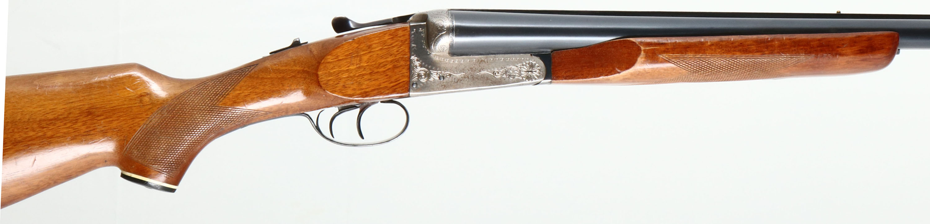 Tradewinds, Model G-1032, CAL: 10GA, MFG: 1960's-70's, SN: 162130, Break Action SxS Shotgun, Choke: F/F, 32'' barrels. The original checkered & capped pistol grip stock, with beavertail forend are very good. There are contusions, scrapes & dings, with thinning finish at the carry points. The restored metal blue finish on the barrels rates 95% overall, with minor blemishes & speckling. The receiver is fully worn to gun metal grey, with light spotting & speckling throughout. The receiver, barrel ends, break lever, trigger guard & screws all display simple ornamental engraving. Bores are very good, they have striations consistent with normal use. The solid, matted rib holds a mid rib & front bead. Stock carries a worn, ventilated black rubber recoil pad. Double triggers. LOP: , DAH: , DAC: . FFL or C&R Req. - Value: 250 to 450