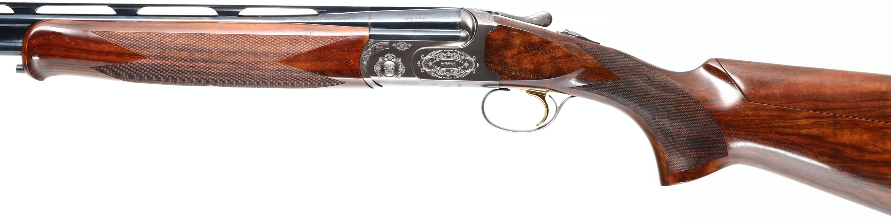 CASED, Caesar Guerini, Model ''Summit Sporting'', CAL: 410GA, MFG: Modern, SN: 118199, O/U Break Action Shotgun, Choke: Selectachoke System, 32'' barrels. The high grade checkered stock, with schnabel forend, adjustable comb & hand rubbed oil finish is excellent, displaying minor handling & storage marks. The hand polished silver finish on the receiver is excellent. The receiver, break lever & trigger guard all display ornamental engravings & patterns alongside the wording ''Caesar Guerini'' & ''SUMMIT''. The metal blue finish on the barrels rates 99% overall, with very minor handling & storage marks. Bores are excellent, displaying light wear from use. The ventilated & matted rib holds a small steel mid-rib bead & white ''Bradley'' style front bead. Stock carries a C.G black rubber recoil pad. Gold tone trigger. Comes in factory hard case, with velvet sleeves for stock & barrel, choke set, owners manual, tools & C.G stickers. This set retails for over $5000 & is without a doubt an efficient tool designed to withstand a lifetime of competitive shooting. FFL Req. - Value: 3000 to 5000