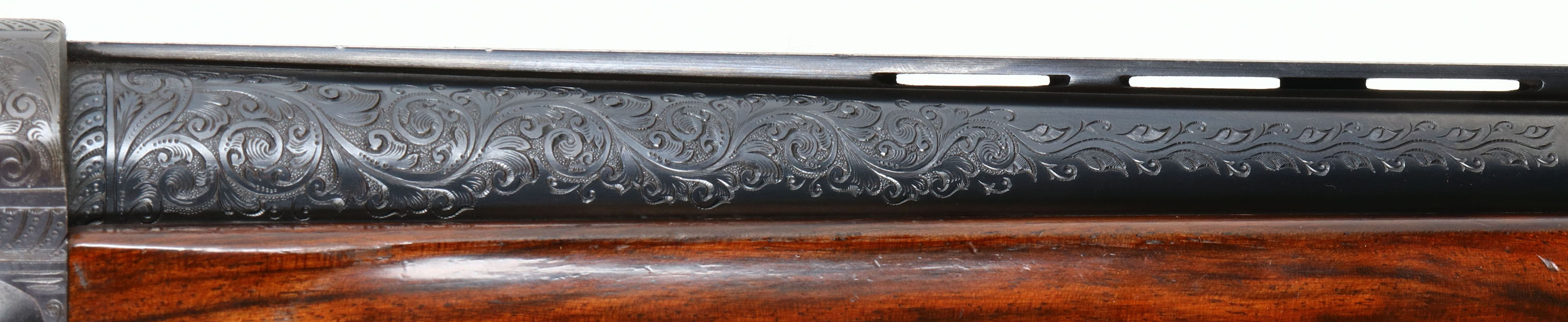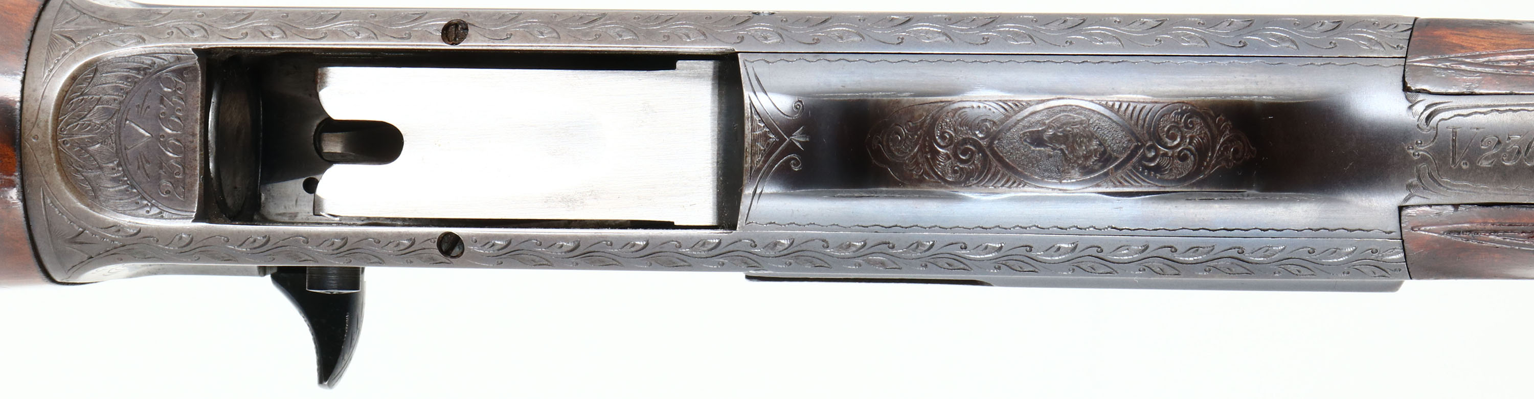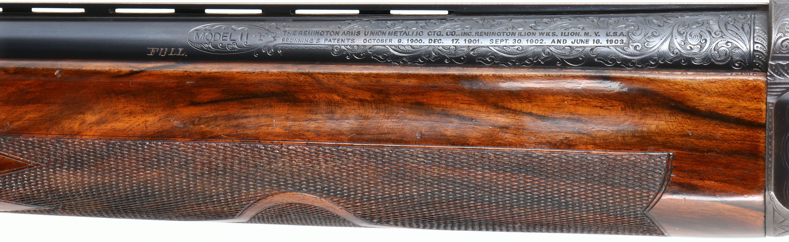 RARE ENGRAVED Remington UMC, Model 11, ''F' PREMIER GRADE or GRADE 6, 12 GA., MFG. 1920, SN: 236639, Semi Auto Shotgun. Marked FULL, 2 3/4'', 28'' Ventilated rib single bead barrel. John Browning presented this design (which he called his best achievement) to Winchester, where he had sold most of his previous designs. When Winchester refused his terms, Browning went to Remington. Tragically, the President of Remington died of a heart attack as Browning waited to offer them the gun. This forced Browning to look overseas to produce the shotgun. It was manufactured by FN (a company that had already produced Browning-designed pistols) starting in 1902 as the Auto 5. Browning would later license the design to Remington, who produced it as their Model 11 (1911-1947). The Remington Model 11 was the first auto-loading shotgun made in America, originally as the ''Remington Autoloading Shotgun (1905-1910)'' before it was changed to the Model 11 in 1911. This is a Special ordered shotgun from Remington's custom shop & master engraved. It displays extensive full coverage engraving, with six separate game scene vignettes featuring pairs of hunting dogs, grouse, snipe & flying mallards. Additional dog's profile engraved on bottom of trigger guard. Remington's Master Engraver at this time was Joseph F. Loy assisted by Simeon S. Rogers. Loy's animal engravings were truly works of art. In those days, Remington did not allow their engravers to sign their work. The engraving details on this example are consistent with Loy's work. The metal blue finish is 97% on barrel, 95% receiver, with loss mainly at the carry point on the belly of the receiver. The fancy, high grade, fine 24 lines per inch hand checkered, capped pistol grip, Circassia walnut stocks are excellent, original & solid, with nice figure. The buttstock has an initial plate that is engraved with ''LS''. The finish is excellent, with a few very minor finish contusions or scrapes. Stock carries a Pachmayr White Line ventilated recoil pad. Bore is excellent, Functionality is excellent & tight. This was the highest grade Model 11 available from the Remington Custom shop in Ilion NY. Fantastic hand craftsmanship.* FFL or C&R Req. - Value: 7000 to 10000