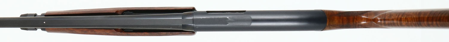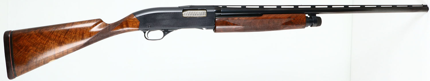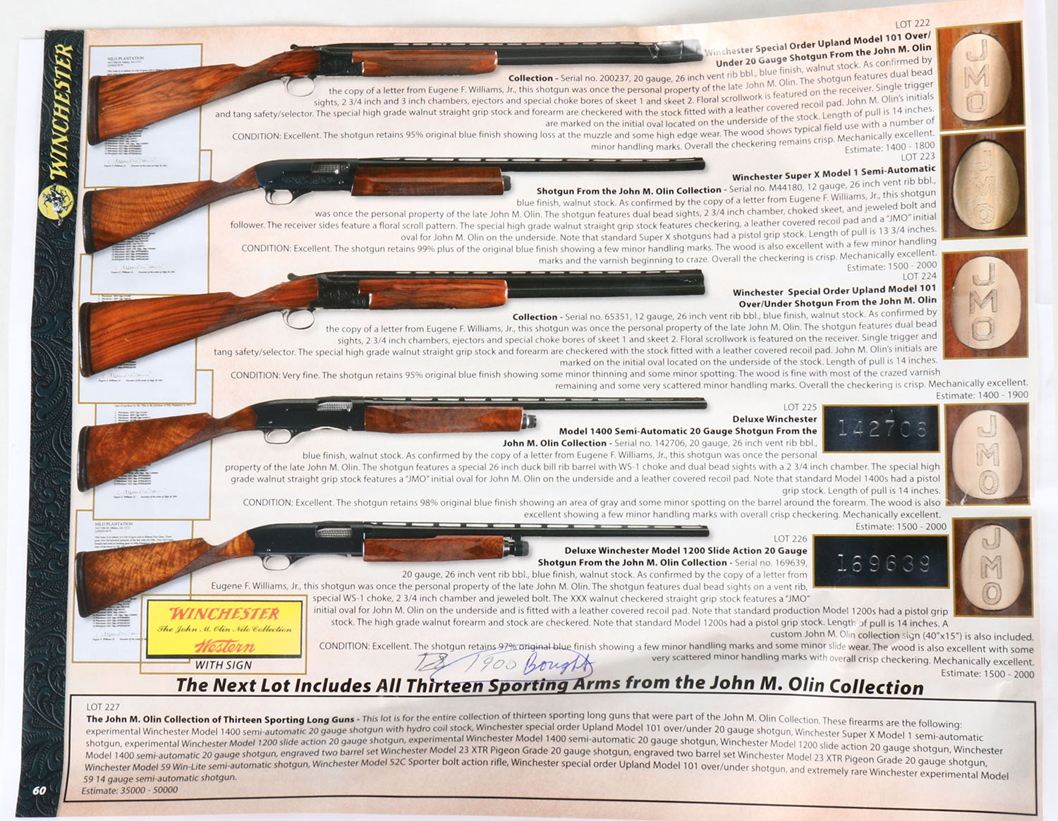 RARE John M. Olin Collection, Winchester, Model 1200 DELUXE, 20 GA., MFG. 1964-65, SN:169639, Pump Action Shotgun, 2 3/4'', WS-1 choke. 26'' Vented rib barrel. This shotgun comes with a copy of a letter from Eugene F. Williams Jr., executer of the Jon M. Olin estate, which lists the guns that were the personal property of the late John M. Olin. The letter states the guns were housed & used as hunting guns on the Family's Nilo Plantation since their manufacture or time of purchase by Mr. Olin, or the purchase of the Nilo Plantation in 1955. This shotgun is the 5th gun on the list. This gun features Special Order XXX walnut, straight grip stocks, with wraparound deluxe checkering. The stocks were specifically made to Mr. Olin's desired shape & dimensions, which is evident by the very narrow wrist dimension, curvature of the lower wrist into the belly & the initial oval in the belly of the stock with Mr. Olin's initials ''JMO''. Note that standard Model 1200's had pistol grip stocks. The stocks display fantastic scalloped & fire grain, with crisp checkering & excellent factory finish. The factory metal blue finish is 97% on receiver, 99% on barrel & tube. Bore is excellent. Front & mid rib sight bead. 14'' LOP over custom leather wrapped recoil pad. Comes with a laminated 14''x4 1/2'' Winchester/ Western yellow sign which was part of a previous display, which states its from ''The John M. Olin Nilo Collection''. A finely crafted, excellent original condition & custom 1200, with wonderful prominence & ownership. Very collectable gun.* FFL Req. - Value: 2000 to 4000