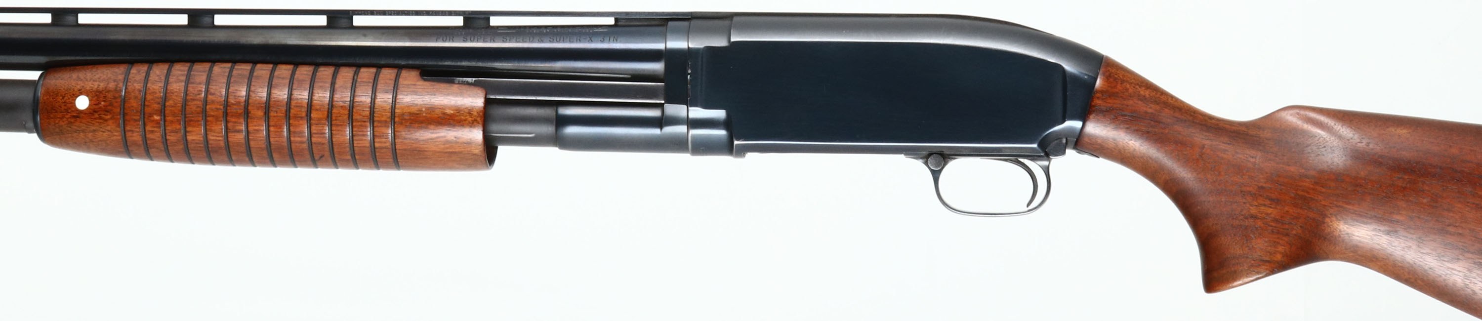 Winchester, Model 12, CAL: 12 GA, MFG: 1955, SN: 1640589, Pump Action Shotgun, Choke: Full, 3'' Chamber, 30'' Ventilated Rib Barrel. The original flat pistol grip wood stock & long corncob forend are excellent, having been lightly sanded & reoiled. There are a few minor contusions remaining. The top of the comb has two round black plastic inlay, while the forend has a the same black inlay on the right & a white inlay on the left. These inlays are nicely done. The restored metal blue finish on the barrel rates 98%, while the receiver appears to retain 95% of the original factory blue on the sides & the matte gray finish on the top. Bore is excellent. Barrel carries a partial white mid bead & a red front bead. Buttstock carries a ventilated Pachmayr White-line recoil pad. LOP: 13 7/8'' overpad. FFL or C&R Req. - Value: 350 to 700