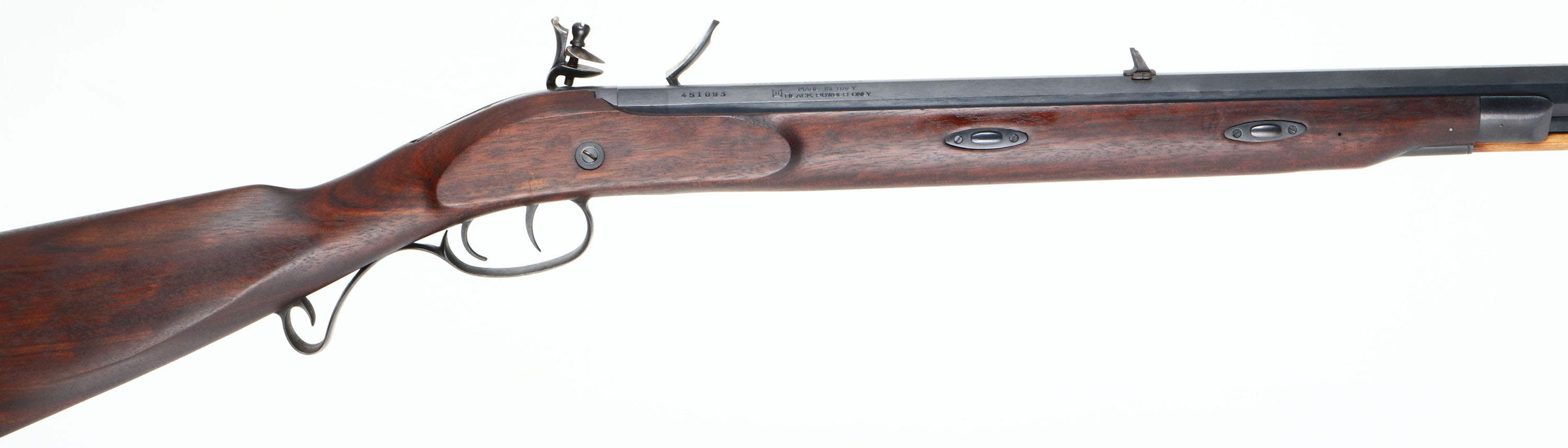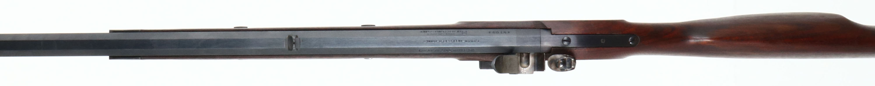 Lyman, Great Plains Rifle (Left Handed), CAL: .50, MFG: modern, S/N: 451093, Flintlock Muzzleloader, 32 1/2 '' octagon barrel. The cheeked straight wrist wood stock is excellent with little to no wear. The metal finish rates 95% with little to no wear or scratches. Left side of barrel is marked, ''GREAT PLAINS RIFLE .50'', top of barrel is marked ''LYMAN-MIDDLEFIELD-CONN.-'', right side of barrel is marked with S/N, & ''MADE IN ITALY'', ''BLACK POWDER ONLY''. Bore is excellent. Thick blade front sight with a deep U-notch rear buckhorn sight, Metal buttplate with little to no wear. Muzzleloader, No FFL Req. - Value: 150 to 300