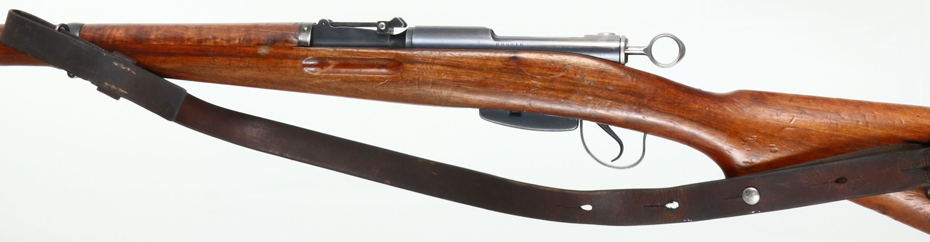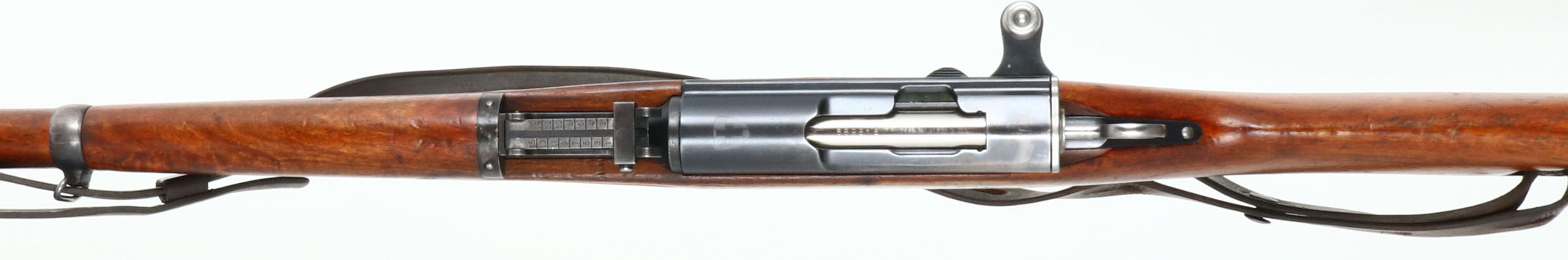 Waffenfabrik Bern, Model: K31 Short Rifle, Cal: 7.5x55mm Swiss, MFG: 1953, S/N: 689816, Straight pull Rifle, 25 3/4'' Barrel. The semi-pistol grip wood sock is very good with light nicks, scratches, ding dents & wear from use/age, Swiss crest on right side of stock by cheek weld. The metal finish rates 85% overall with spots of thinned bluing. Left side of receiver is marked with S/N & importer marks, top of receiver is marked with Swiss crest, top of barrel is marked, ''816'', ''BP'', & other proof marks, S/N Matched Bolt, barrel, & magazine. Bore is excellent, bright with minor wear. Blade front sight with protective wings, U-notch tangent rear sight marked 1 to 15. Metal buttplate with minor wear, Side sling mounts, comes with a original Swiss K31 leather sling. FFL or C&R Req. - Value: 400 to 800