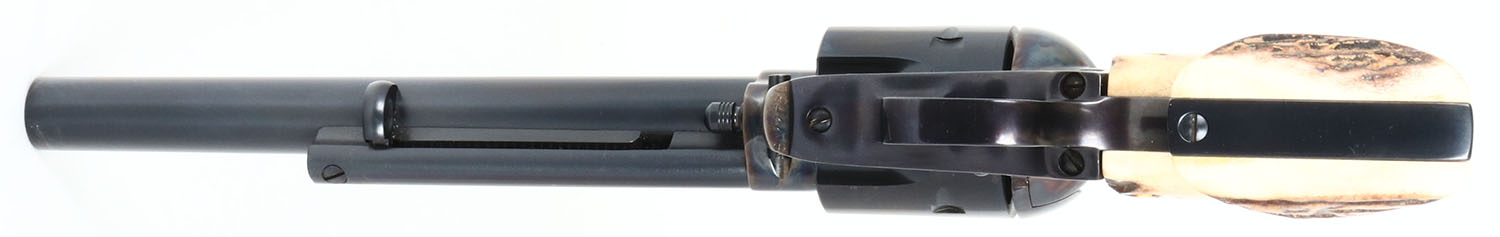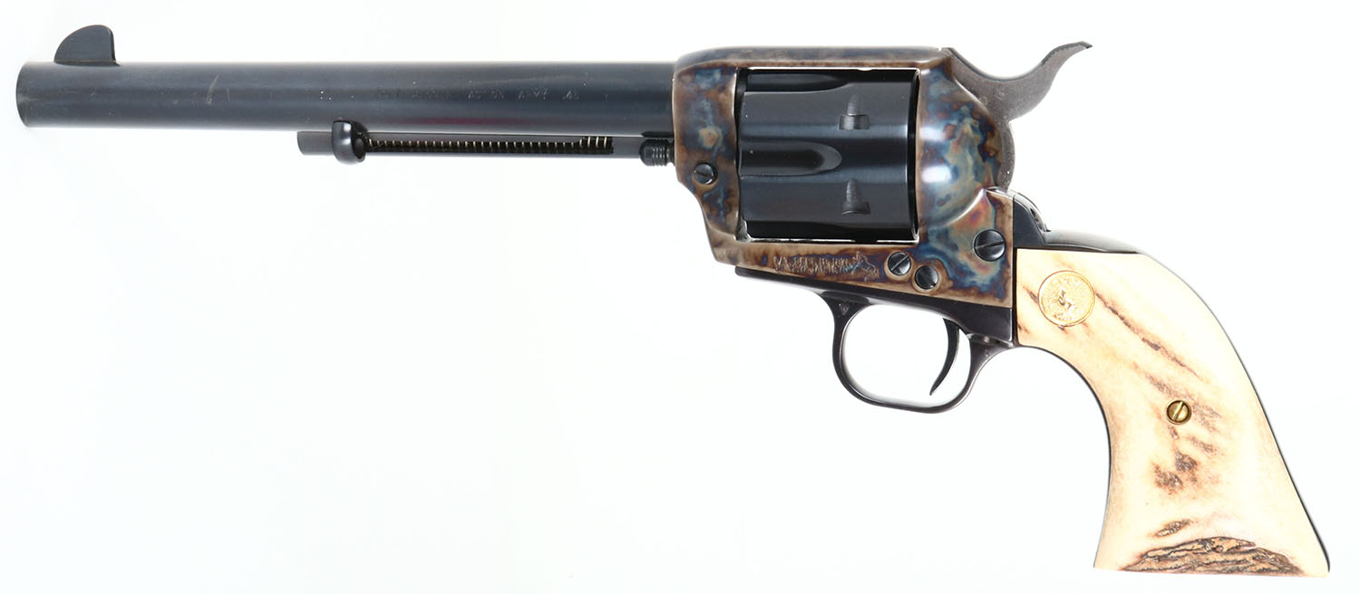 BOXED Colt, Single Action Army (P1870), CAL: .45 COLT, MFG: 1978-93, SN: SA11750. Single Action Revolver, 7 1/2'' barrel. The top of the barrel is marked ''COLT'S PT F.A. MFG. CO. HARTFORD CT. U.S.A.'', The left side of the barrel is marked ''COLT SINGLE ACTION ARMY 45''. The left side of the frame is marked with the Rampant Colt logo above the trigger guard & next to patent dates. The full SN can be found on the frame. The fantastic original stag & Rampant Colt medallion grips are excellent. The factory metal blue finishes rate 99%. The case-hardened frame displays vivid case-colors. Bore is excellent & bright. The barrel holds a blade front sight. Comes in the original factory wood grain box, with Colt ''Congratulations'' letter, hang tag, Owner instruction booklet & other pamphlets. FFL Req. - Value: 1500 to 2500