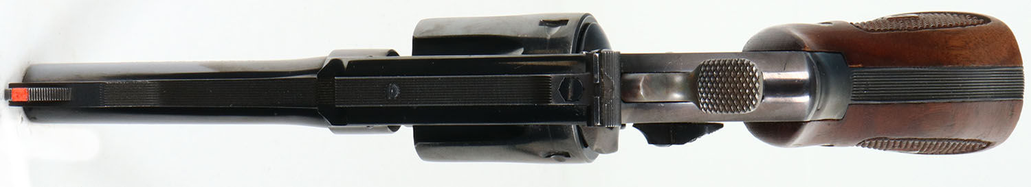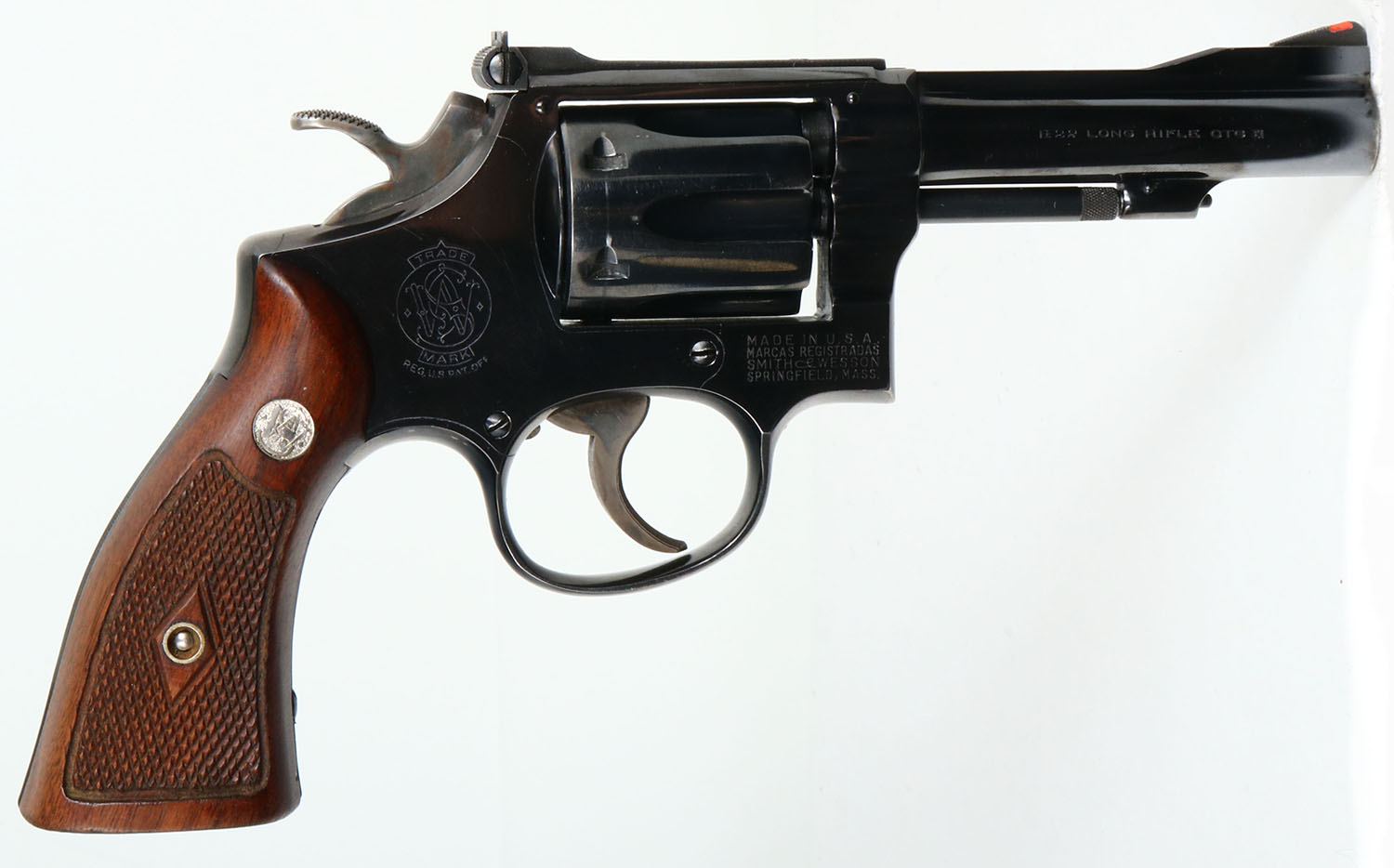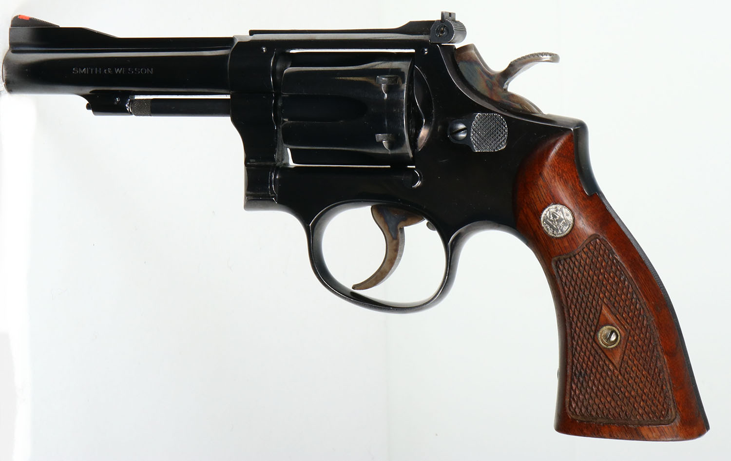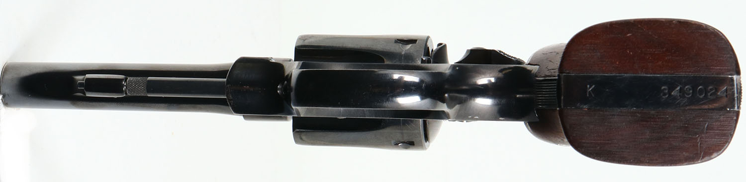 Smith & Wesson, Model 18, K22 Combat Masterpiece, 4 Screw, CAL: 22LR, MFG: 1958, SN: K349024, Double Action Revolver, 4'' barrel. The left side of the barrel is marked ''SMITH & WESSON''. The right side of the frame is marked with the S&W trademark logo & the standard four line address stamp. The right side of the barrel is marked ''22 LONG RIFLE CTG''. The original S&W logo silver medallion & checkered diamond wood grips are excellent. The original metal blue finish rates 98% overall, with numerous thin brush lines. The trigger & target hammer are case-hardened, retaining full case-colors. Bore is excellent. The frame holds an adjustable rear sight & ramp elevated blade front sight, with orange insert. A high condition Model 18. FFL or C&R Req. - Value: 700 to 1200