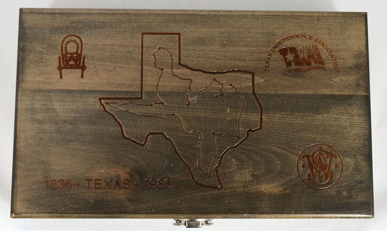 CASED, Smith & Wesson, Model 544 ''Texas Wagontrain Commemorative'', CAL: 44-40, MFG: 1986 ONLY, SN: 7918X, Double Action Revolver, 5'' barrel. The right side of the frame is marked with the Texas Wagontrain Commemorative seal & the standard four line address. The right side of the barrel is marked ''1836 TEXAS 1986''. The left side of the barrel is marked in two lines ''SMITH & WESSON 44/40'' & the left side of the frame, above the grip has the S&W trademark logo. The S&W medallion smooth grips with high gloss finish are excellent. The metal blue finish rates 98% overall. The trigger & hammer are case-hardened, retaining full case-colors. Bore is excellent. The frame holds an adjustable rear sight & blade front sight, with orange insert. Comes in original commemorative wood case, with blue velvet interior. They produced these revolvers one year & only made 4,782. FFL Req. - Value: 1000 to 2000
