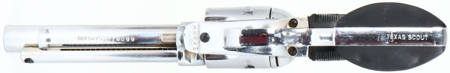 German Made, Model ''Texas Scout'', CAL: 22LR, MFG: Modern, SN: 74099, Single Action Revolver, 4 3/4'' barrel. The Buffalo logo checkered plastic grips are excellent, with minor handling marks. The nickel finish is very good & full. Bore is excellent. Notch & blade sights. Comes with a weave pattern leather holster. FFL Req. - Value: 200 to 300