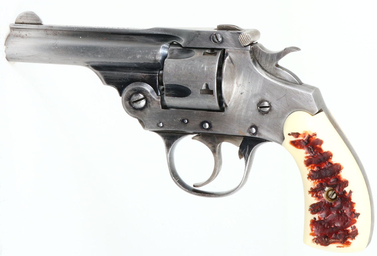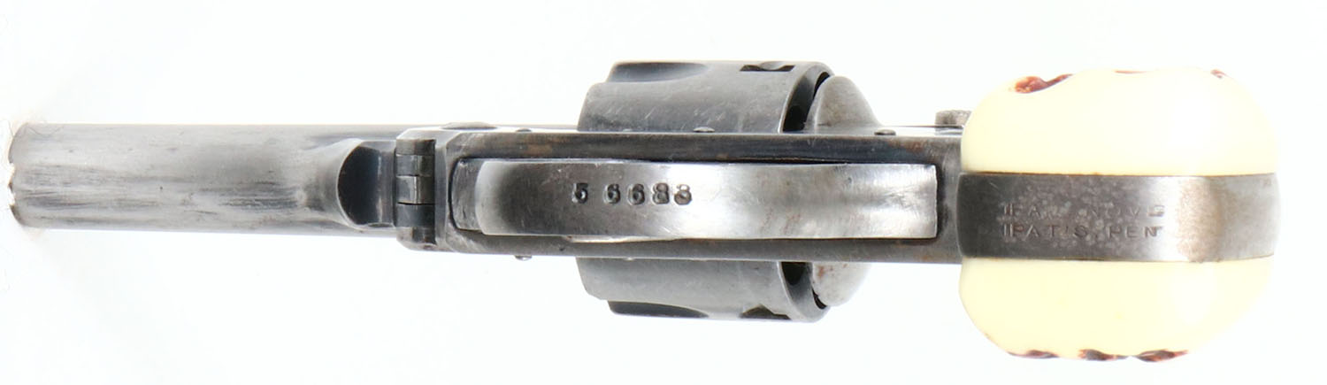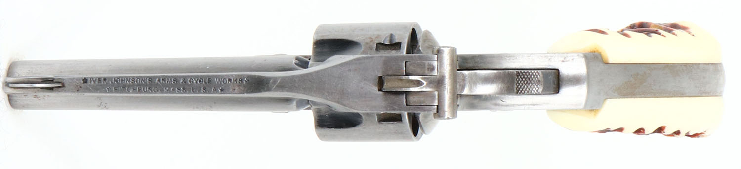 Iver Johnson, Top Break Revolver, CAL: 32, MFG: N/A, SN: 56683, Double Action Revolver, 3'' barrel. The faux stag grips are excellent. The bottom of the right grip has a very small edge chip. The metal blue finish has been buffed to metal grey, with remnants in protected areas. Bore is excellent, with intermittent roughness. Notch & blade sights. FFL or C&R Req. - Value: 100 to 250