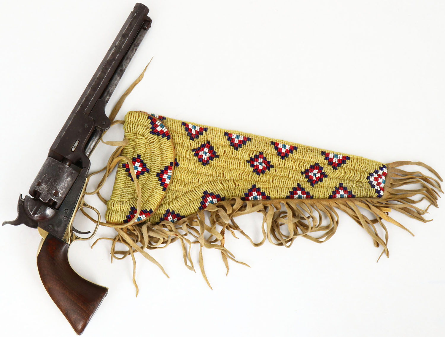 Colt, Model 1851 Navy, CAL: 36, MFG: 1863, SN: 148561, Single Action Percussion Revolver, 7 1/2'' barrel. Historical as a Native American owned Colt, with fantastic leather sheath, displaying wonderful & authentic native beaded work. The top of the barrel is marked ''--ADDRESS SAM L COLT NEW YORK U.S. AMERICA--''. The left side of the frame is marked ''COLT'S PATENT''. The cylinder is marked with a 'M'', with the naval engagement long since worn away. The full matching SN is displayed on the barrel, frame, trigger guard & butt. The original wood grips are very good & solid, some remains of original finish with light scrapes & minor edge nicks & dings. The metal has fully toned to a brown patina, with rust pitting. The trigger guard & backstrap are brass. Bore is good, with pitting amongst proud rifling. The barrel front dovetail is open & the hammer (when cocked) has an integrated groove acting as a rear sight. The metal surfaces display lots of abrasions, contusions & nicks consistent with old west, frontier & Native American use & ownershjp. The revolver needs a good cleaning & oiling, but also likely needs some gunsmith work to restore functionality. Hammer & trigger do not function correctly. Some parts many need repair or replacing. Nicely displayed in a wood & glass display case. Antique, No FFL Req. - Value: 1000 to 4000