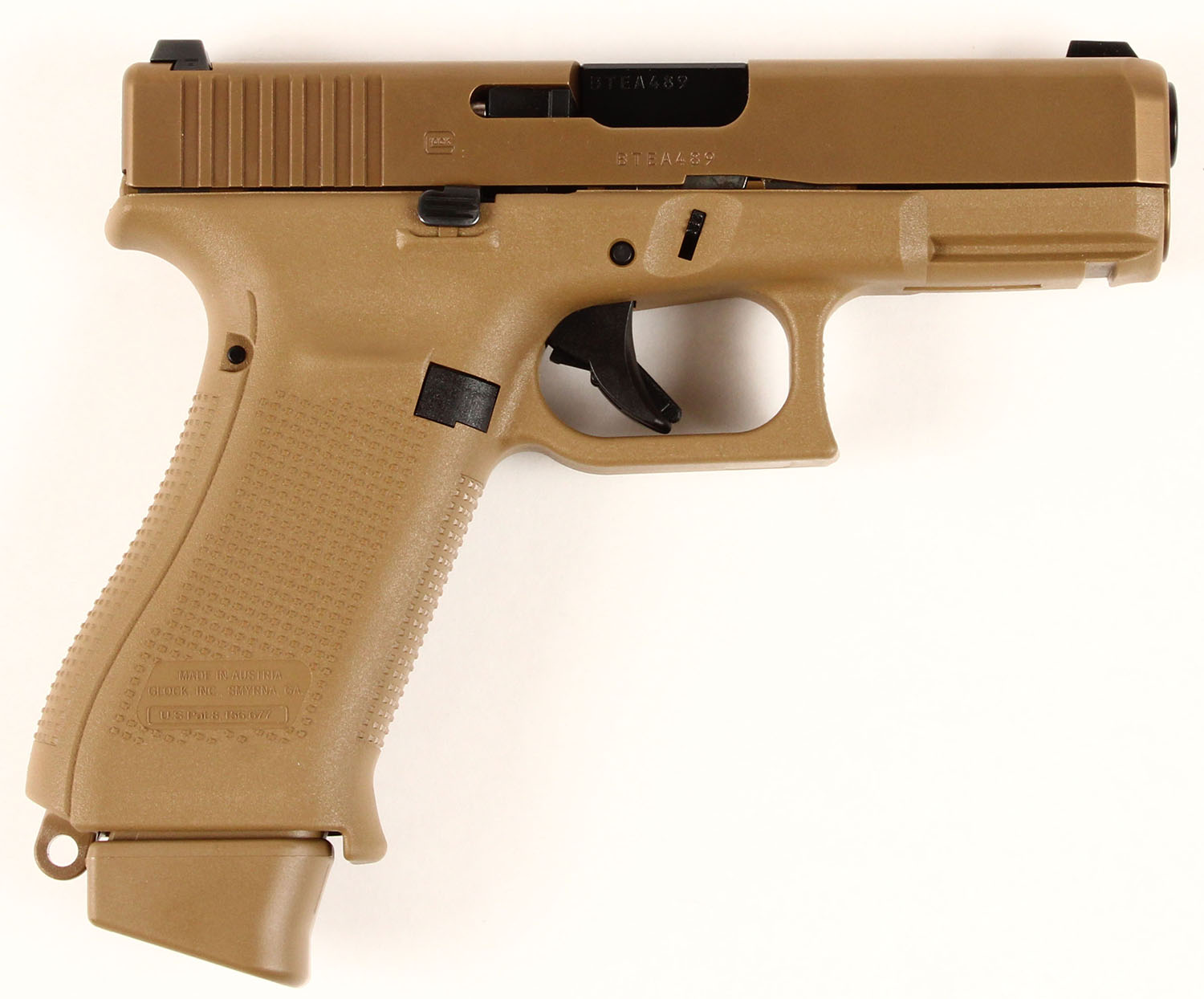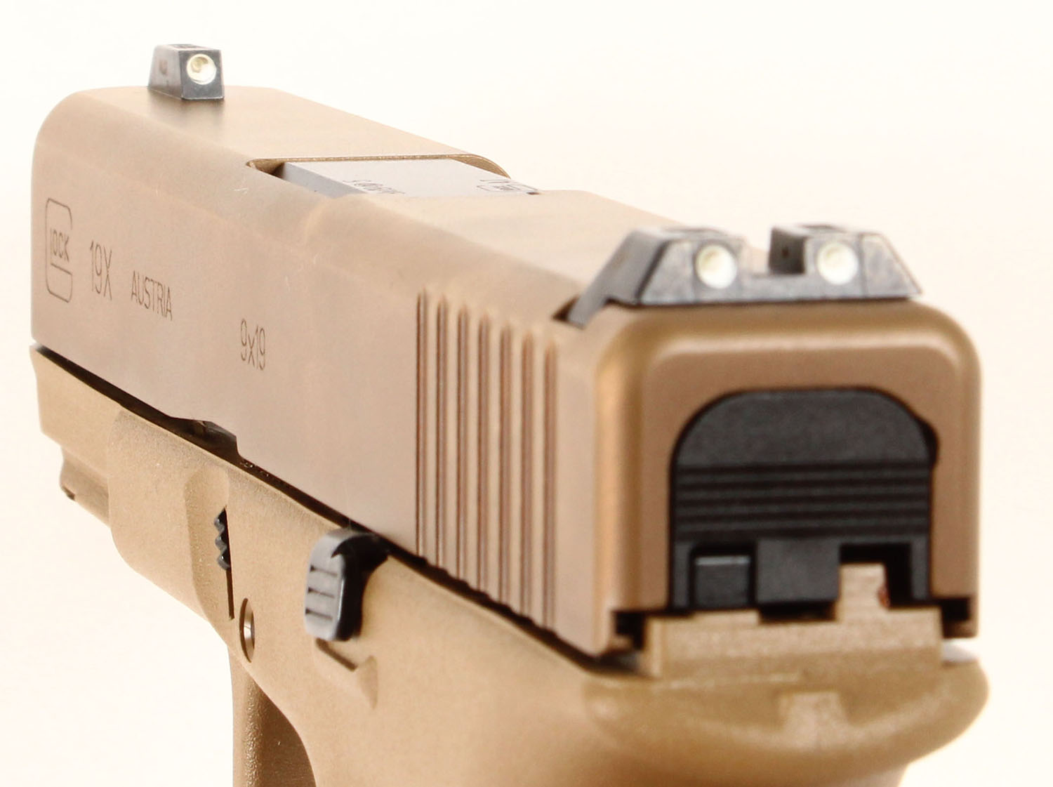 NEW CASED, Glock, Model 19X GEN 5, CAL: 9mm (9x19), MFG: Modern, Semi-Auto Pistol, 4'' barrel. The polymer frame & grips are mint. The Coyote nPVD coated slide is mint. Bore is mint. Factory rear two dot night sight & front dot night sight. Comes in the original factory case with owners manual, lock/key, cleaning rod/brush, grip attachments, (3) 17rd mags & speed loader. NOS. FFL Req. - Value: 600 to 750