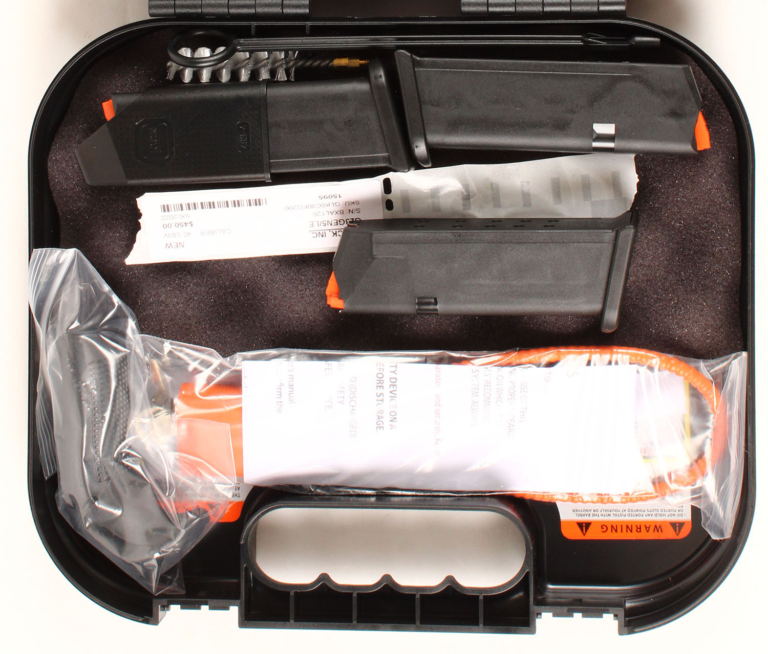 NEW CASED, Glock, Model 23 Gen 5, CAL: 40, MFG: Modern, Semi Auto Pistol, 3 1/2'' barrel. The textured polymer grip & frame are mint. The factory matte black finish is mint. Bore is mint. Factory square notch rear sight & single dot front sight. Comes in factory hard case, with owners manual, lock/key, cleaning rod/brush, grip attatchments, (3) 13rd mags & speed loader. NOS. FFL Req. - Value: 500 to 650