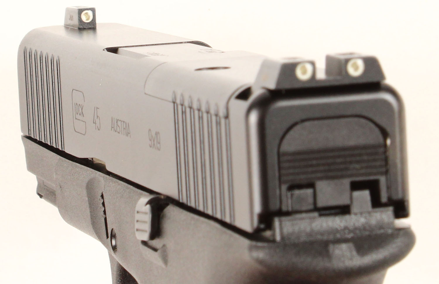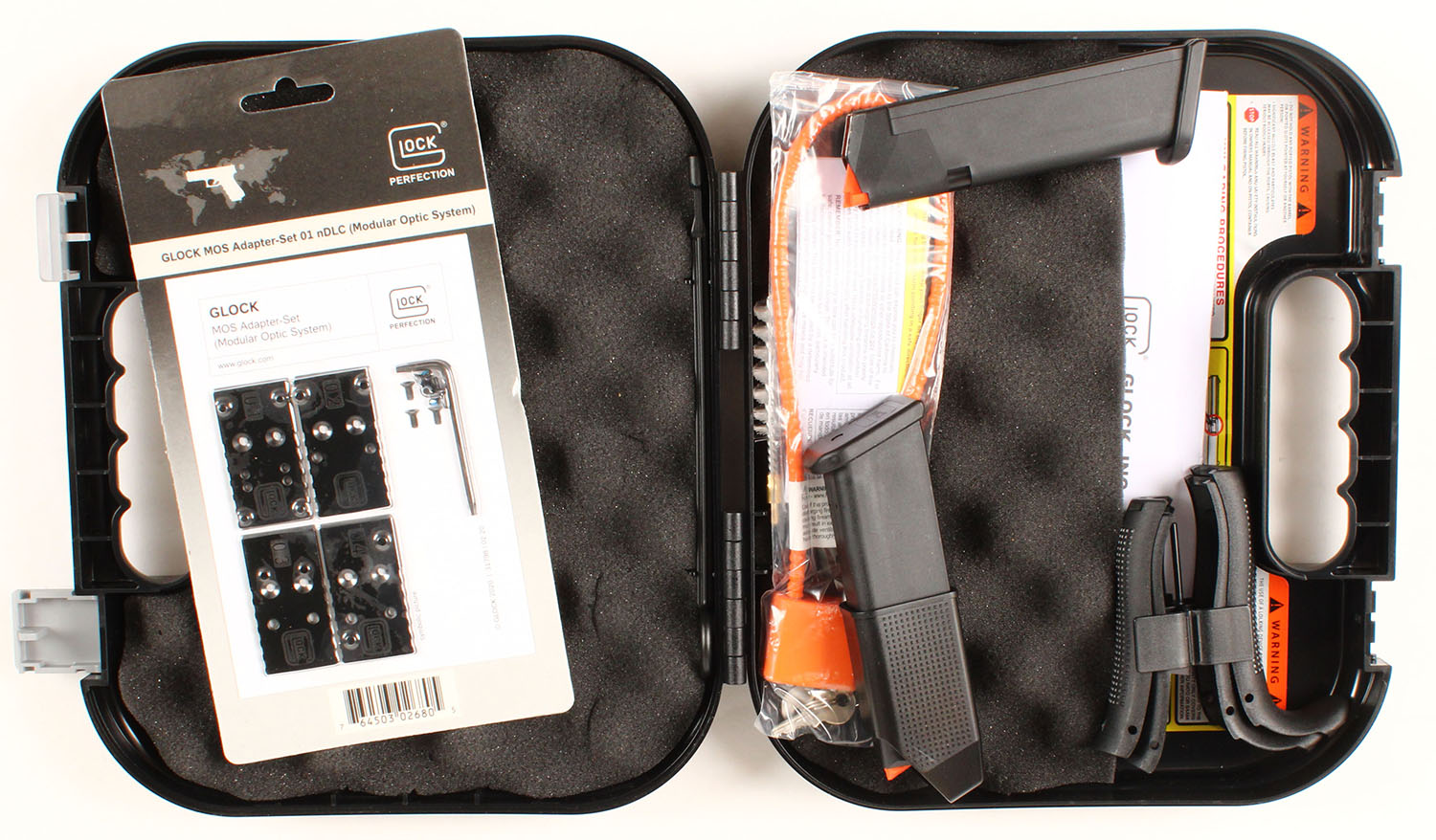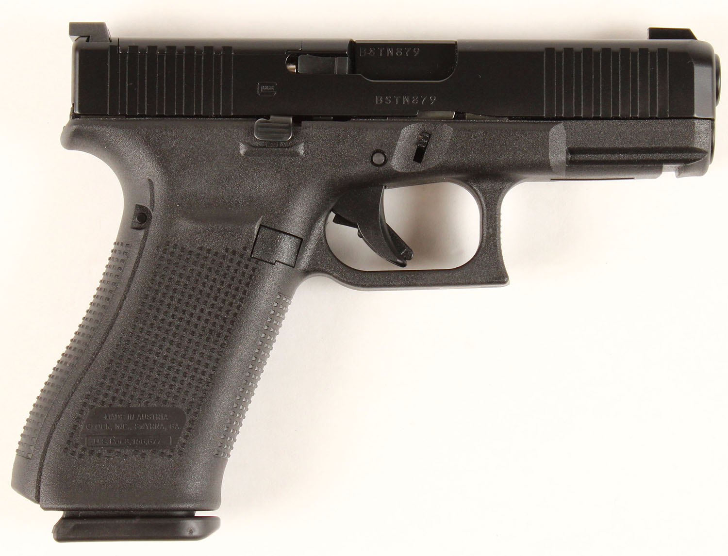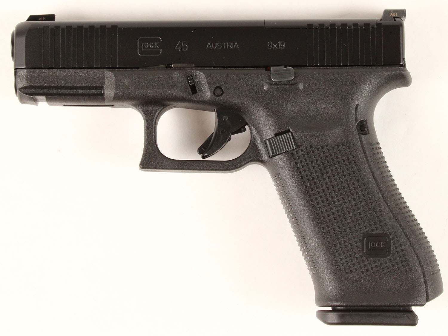 NEW CASED, Glock, Model 45 Gen 5 MOS, CAL: 9mm, MFG: Modern, Semi Auto Pistol, 4'' barrel. The textured polymer grip & frame are mint. The factory matte black finish is mint. Bore is mint. Factory rear two dot night sight & front dot night sight. Comes in factory hard case, with owners manual, lock/key, cleaning rod/brush, grip attatchments, Glock MOS Adapter Set 01, (3) 17rd mags & speed loader. NOS. FFL Req. - Value: 500 to 650