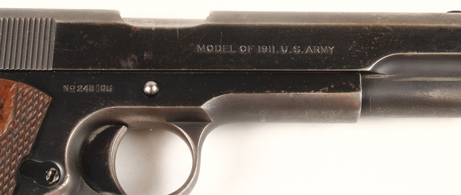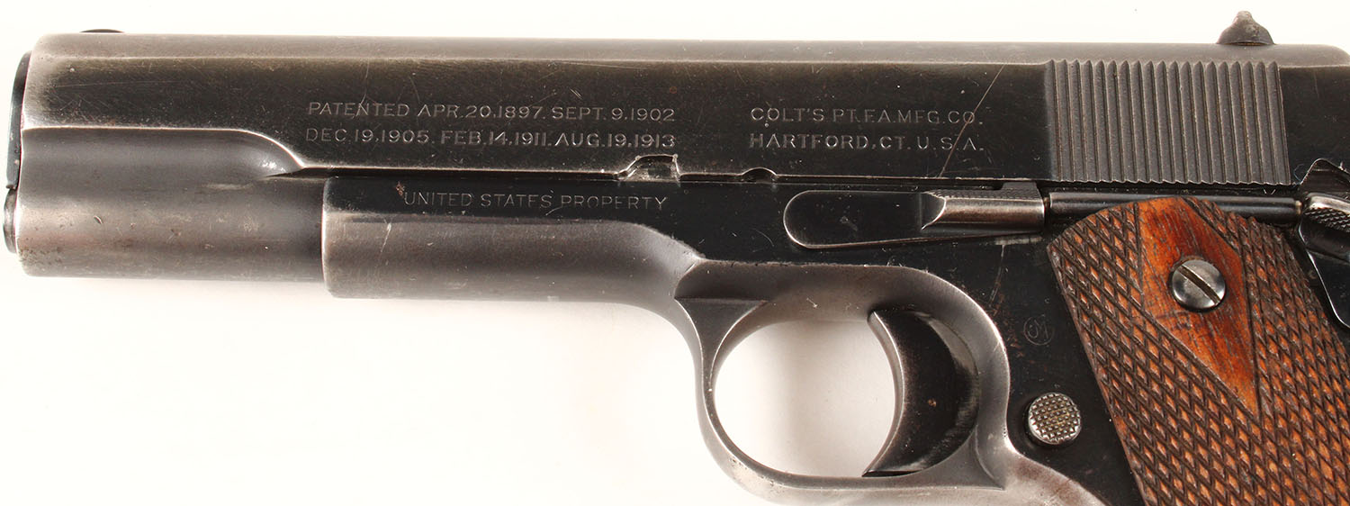 WWI Era Colt, Model 1911- U.S. ARMY, CAL: 45 ACP, Semi-Auto, MFG: 1918, WWI era, SN: 248105, 5'' barrel. This pistol is fitted with the double diamond checkered walnut grips, which are very good, with minor contusions. The right grip is stamped with 1/2'' initials of a backwards ''J'' & a normal ''L''. It has the two-line, two-block Colt factory address & patent dates markings of ''PATENTED APR.20.1897. SEPT.9.1902. DEC.19.1905. FEB.14.1911. AUG.19.1913'' followed by ''COLT'S PT.F.A. MFG. CO. HARTFORD.CT.U.S.A.''. The left side of the frame is stamped ''UNITED STATES PROPERTY''. The right side of the slide is stamped ''MODEL OF 1911. U.S. ARMY''. The right side of the small SN markings of ''No. 248105'', with the circled ''JM'' monogram of Ordnance Inspector above the magazine release. The rear face of the slide, as well as the top of the receiver, are all correctly stamped with the ''H'' provisional inspection mark of Frank L. Hosmer, the U.S. Government inspector who started inspecting these at approximately pistol SN ''400''. The pistol comes with two magazines, one marked ''COLT 45 AUTO'', the other unmarked. The extra unmarked mag had rust pitting that was scrubbed. There is a lanyard loop on the underside of the strap base. The metal blue finish is 70% overall, with most of the wear to the straps & forward portion of slide. The bore is very good, with spotty areas of light roughness. Appears mechanically sound. This is a very nice U.S. ARMY Colt Model 1911 semi-automatic pistol. FFL or C&R Req. - Value: 1500 to 3000