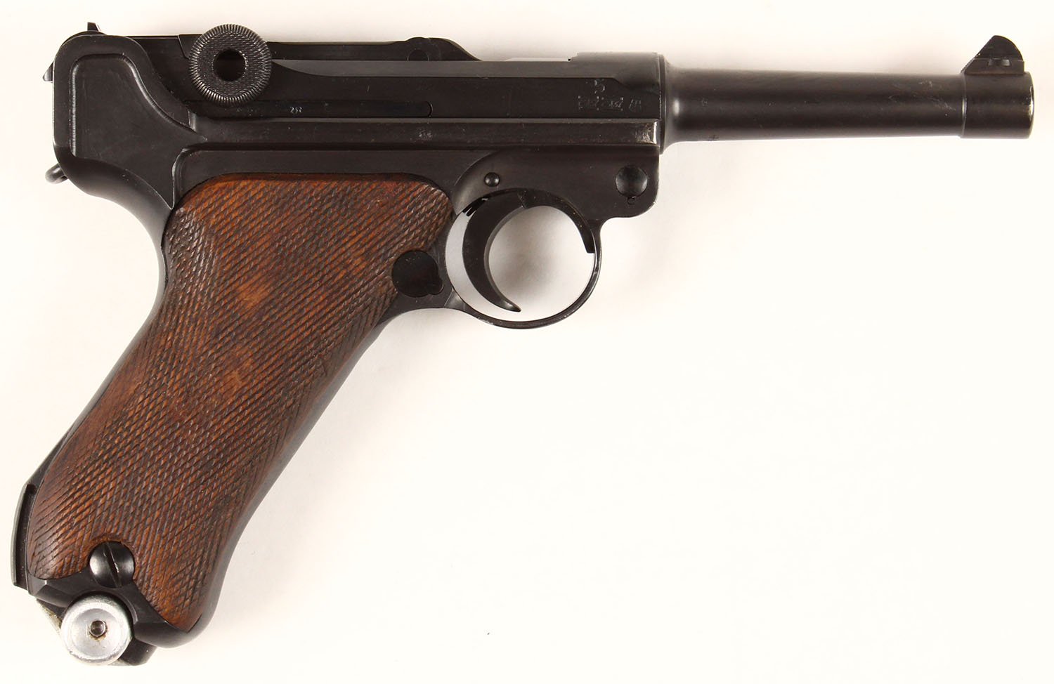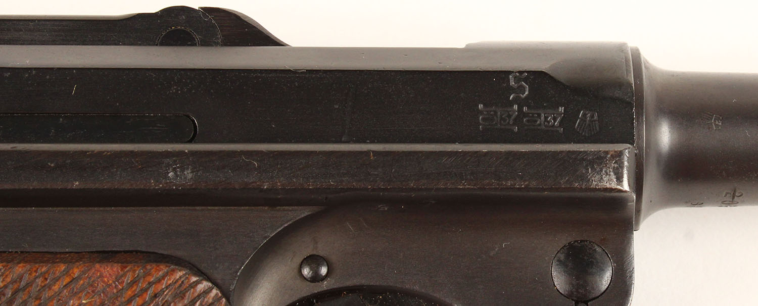 RARE & DESIREABLE, Early Nazi Mauser ''K-Date'' Military Luger, CAL: 9mm, MFG: 1934, SN: 8209, Semi Auto Pistol, 4'' barrel. The ''K-Date'' P.08 Lugers were manufactured by Mauser for the German Army in 1934 & represent the very first true German Army contract pistol. The ''K'' was developed as a secret wartime code by the Mauser factory to conceal the fact that Germany was rearming in violation of the Treaty of Versailles. The date of manufacture was coded to keep it secret. Approximately 10,500 produced. The full SN can be found on the front of the frame & left side of the receiver. The last two digits of the SN (09) can be found in multiple locations throughout the pistol. The number (19) can be seen on the extractor & (39) can be found on the left side of the breechblock. There appear to be some factory overstamps. The bottom of the barrel has a crossed out (2039) with ''8,83'' below it. A gothic style ''S'' can be found on the left side partially behind the side plate, on the right side of the breechblock above the frame & on the forward right of the receiver above the early 1st variation German military proof marks. The left side of the barrel also carries the early 1st variation German military proof mark. The upper position of the safety is marked ''GESICHERT'' & can be seen when the safety is in the lowered position. The checkered walnut grips are excellent & solid. The edges of the grips' checkering has been worn smooth from use. The metal blue finish rates 95%, with some areas that appear to be touched up. Bore is excellent, with minor speckling amongst proud rifling. The rear toggle link carries a fixed notch rear sight & the barrel has a blade front sight. Non-matching SN magazine. These early Wehrmacht P.08 pistols have an extremely low survival rate as almost all saw extensive service use on the Eastern front. This is an opportunity to obtain a good representative of a scarce ''K-Date'' Luger pistol. FFL or C&R Req. - Value: 1500 to 3000