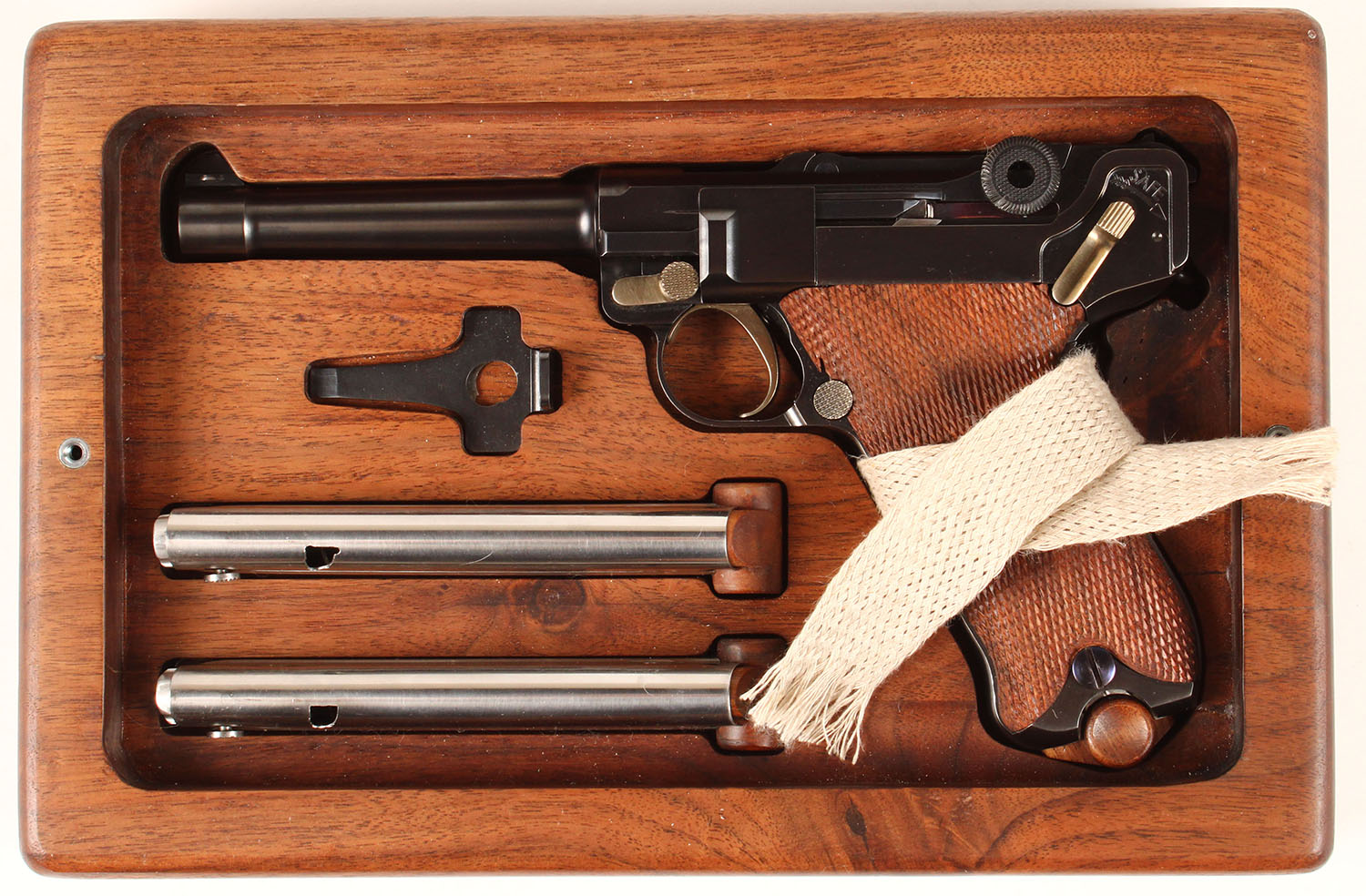 CASED, LugerMan Inc, Luger 1907 Classic, CAL: 45 AUTO, MFG: Modern, SN: 51, Semi Auto Pistol, 4 3/4'' barrel. The top of the slide is marked ''LMI'' in a similar fashion to the original ''DWM'' logo. The SN (51) can be found on the bottom of the barrel, front of the frame, back of the frame & on the bottom of the side plate. The bottom of the barrel is stamped ''45 AUTO'' & the right side of the frame is marked ''LUGER MAN INC LEVITTOWN PA USA''. The original hand checkered walnut grips are excellent & minty. The hand finished metal blue rates 99%+ overall. Gold tone trigger, safety & take down lever. The rear toggle link has a fixed notch rear sight & the barrel holds a blade front sight. Comes in a beautiful wood presentation case, with clear screw-in top. In the case is loading tool & two extra mags. A very high quality reproduction Luger. This pistol retails on LugerMan.com for $8395. FFL Req. - Value: 6000 to 9000