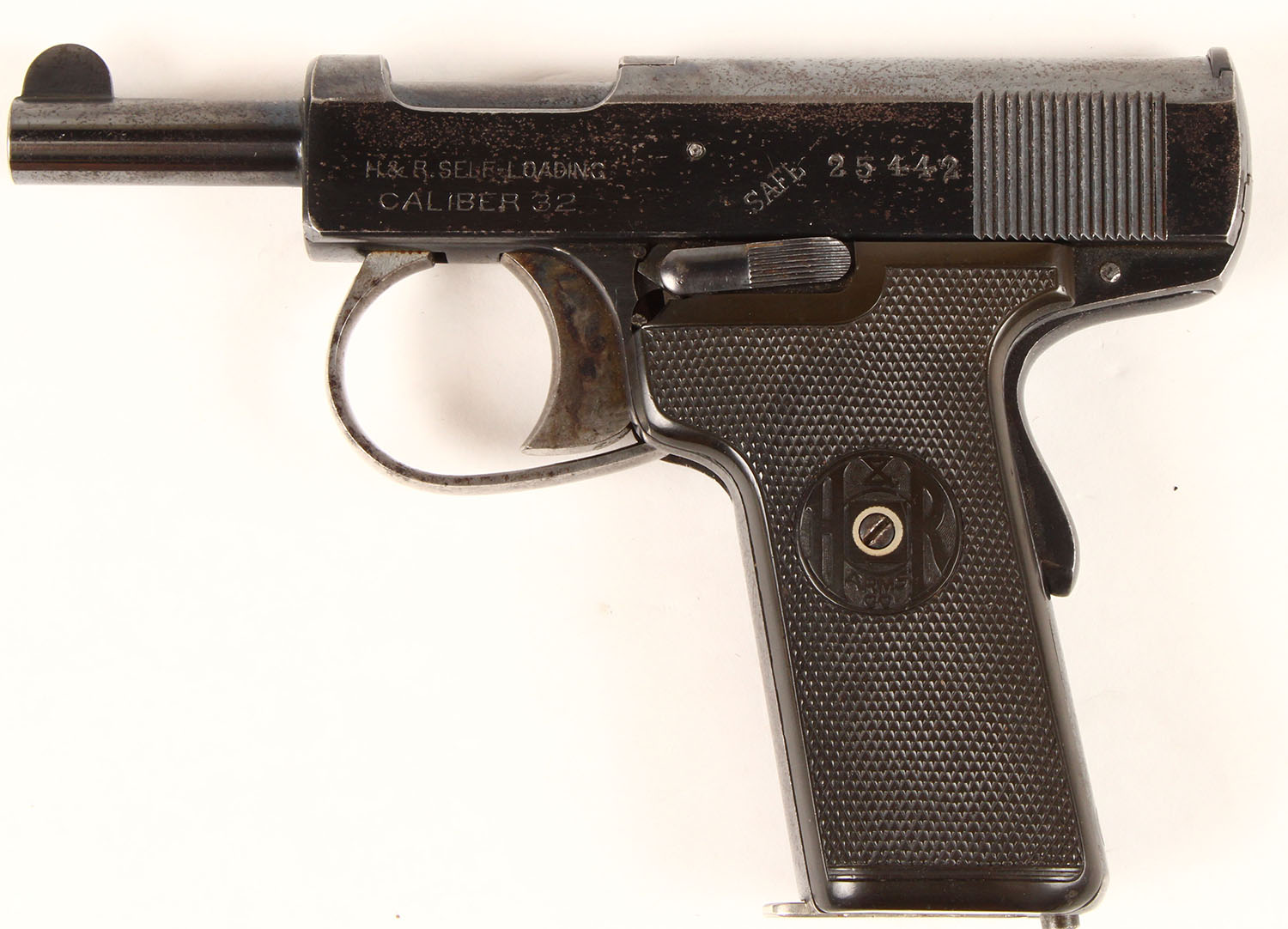 Harrington & Richardson, Model ''Self-Loading'', 3rd Issue, CAL: 32, MFG: 1914-24, SN: 25442, Semi-Auto Pistol, 3 1/2'' barrel. The H&R marked, checkered brown hard rubber grips are excellent, with minor handling marks & one small chip at the upper corner of the left grip near the safety lever. The metal blue finish rates 80%, with consistent spotting throughout & areas worn to metal grey. Stampings are clear. Bore is very good, slightly rough, displaying normal wear from honest use. The slide holds a notch rear sight & the barrel holds a tall halfmoon blade front sight. FFL or C&R Req. - Value: 500 to 900