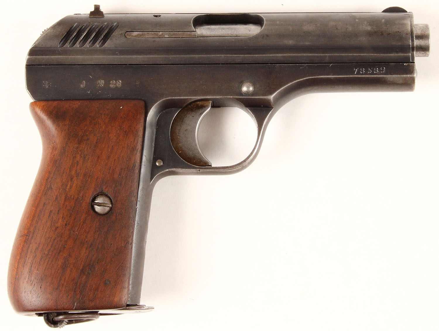 CZ, Model CZ-24, CAL: 380, MFG: 1928, SN: 78589, Semi-Auto Pistol, 3 1/2'' barrel. The original wood grips are excellent & solid, having been refinished. The metal blue finish rates 70% overall, with areas worn to metal grey & intermittent speckling. Stamping are crisp. Bore is very good, with light spotting throughout. The slide holds notch & blade sights. Lanyard loop. Spring loaded click button safety. FFL or C&R Req. - Value: 400 to 800
