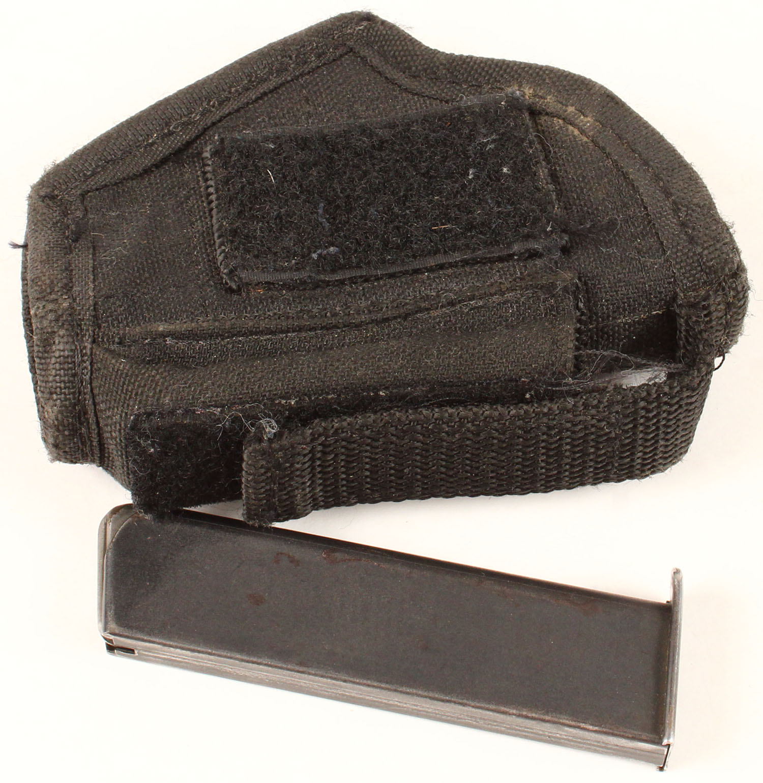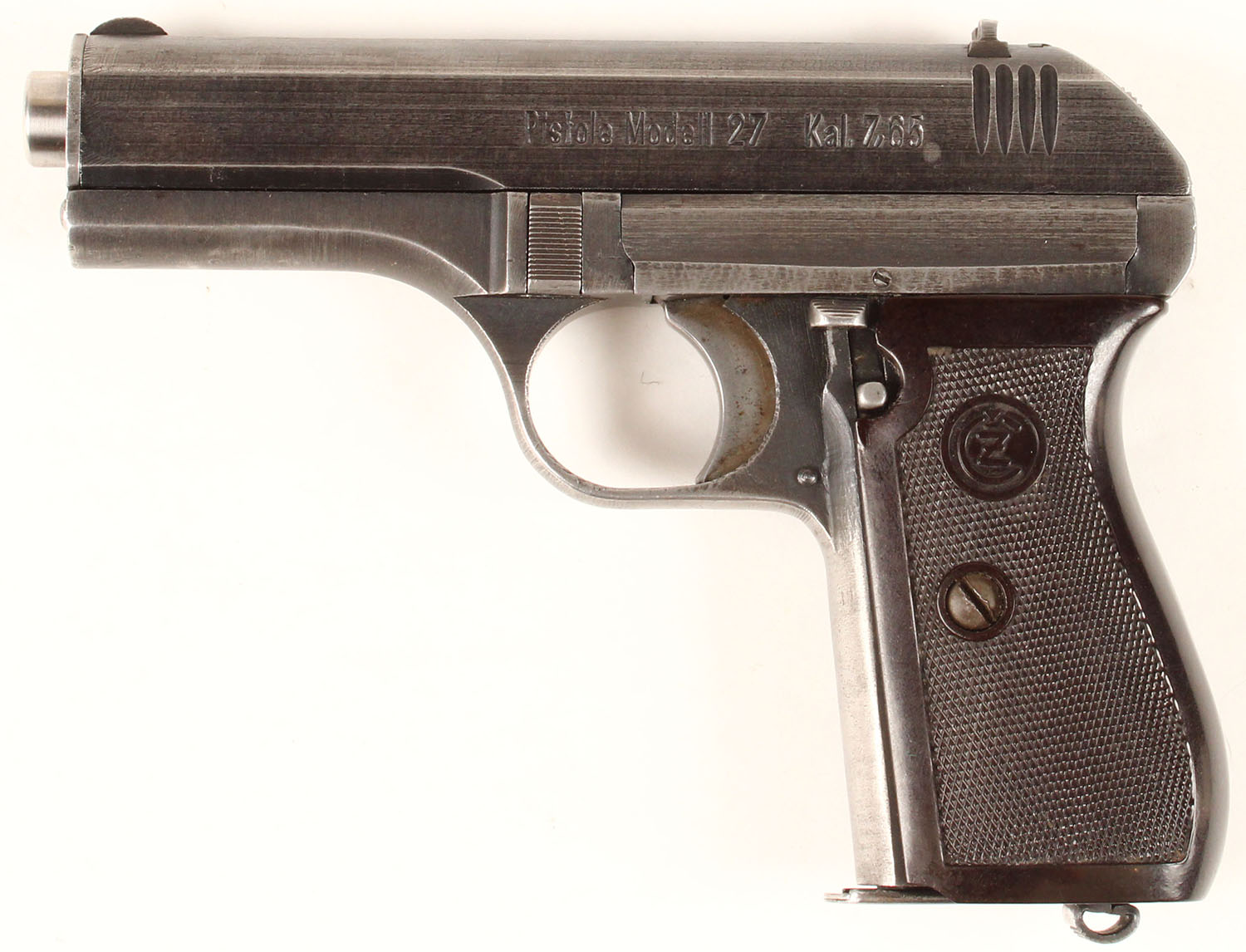 Bohmische Waffenfabrik, Model: VZ 27 (P.27), Cal: 7.65 (32 ACP), MFG: 1939-45, S/N: 244577, semi auto pistol, 4'' barrel. The plastic checkered grips are good with chunk missing at the top of right grip, & scratches & wear from use/age. The metal finish rates 65% overall with finish remaining in most areas just thinned & worn. Left side of slide is marked ''Pistole Modell 27'' ''Kal. 7,65'', top op slide is marked ''BOHMISCHE WAFFENFABRIK A. G.IN PRAG'' & S/N, right side of frame is marked with a Waffenamt proof mark. Bore is excellent, bright & mirror like with no roughness. Blade front sight, V-notch rear sight. Comes with aftermarket holster & spare mag. FFL or C&R Req - Value: 400 to 800
