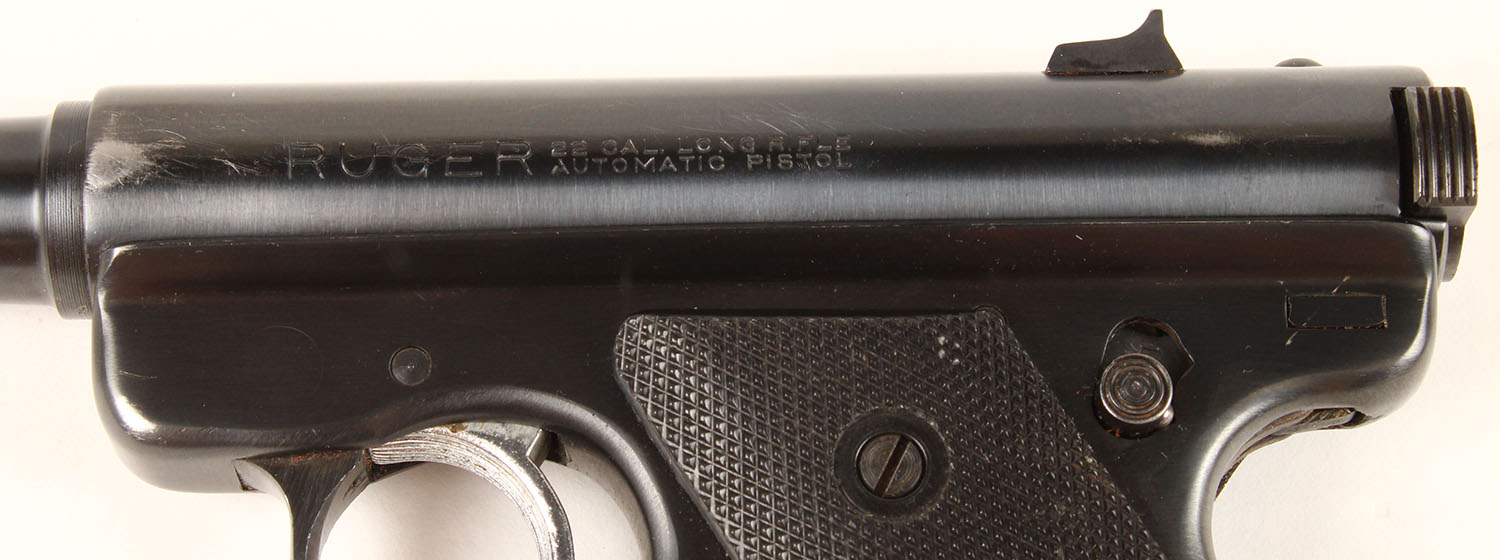 Ruger, Standard Model, CAL: 22LR, MFG: 1964, SN: 255910, Semi Auto Pistol, 6'' barrel. The Ruger logo checkered plastic grips are excellent, with minor scuffs & handling marks. The metal blue finish rates 95% overall. Bore is excellent & bright. The frame holds a notch rear sight & elevated blade front sight. FFL or C&R Req. - Value: 250 to 500