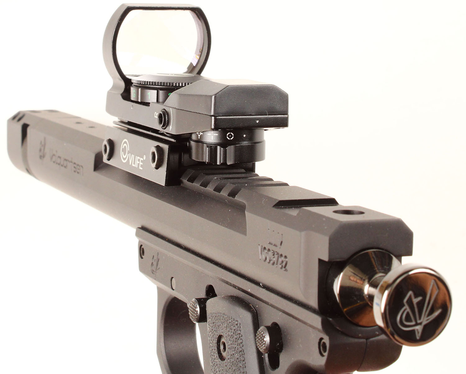 CASED, Volquartsen, Scorpion, 1911 Style Frame, CAL: 22LR, MFG: Modern, SN: VC03792, Semi Auto Pistol, 7 5/8'' barrel. Volquartsen has combined their LLV competition upper with their lightweight VF Target Frame to create a very lightweight & extremely accurate pistol. The upgraded beaded Hogue grips are excellent. The matte black finish rates 99%+overall. Bore is excellent & bright, with sharp rifling. The LLV upper holds a VLIFE Holographic sight, it has both green & red color options, with (4) different reticles to choose from. There is an open rear dovetail for target rear sights & two filled screw holes for a rail fiber optic front sight. Comes in factory Volquartsen hard case, with (2) Ruger mags & disassembly tool for the LLV upper. An extremely high quality target pistol, ready for the range! FFL Req. - Value: 1400 to 2200