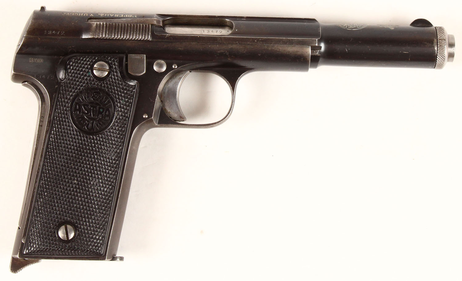 Astra, Model 1921 (400), CAL: 9mm, MFG. 1921-50, SN: 13472, Semi Auto Pistol, 6'' barrel. This pistol was the standard issue sidearm in the Spanish Army during the Spanish Civil War & also saw service in Germany during World War II. Designed to be safe to fire with a simple blowback action unaided by any breech-locking devices. The pistol also featured an internal hammer & left sided combined slide lock/safety behind the trigger guard. The Astra marked checkered plastic grips are excellent, with handling wear. The metal blue finish is a mix of original & applied blue rating 85% overall, with small areas of cleaned pitting on the left side of the pistol. Stampings are clear. Bore is very good, but consistently rough throughout. Fixed notch & blade sights. Astra stamped 8 round detachable mag. Lanyard staple. FFL or C&R Req. - Value: 200 to 400