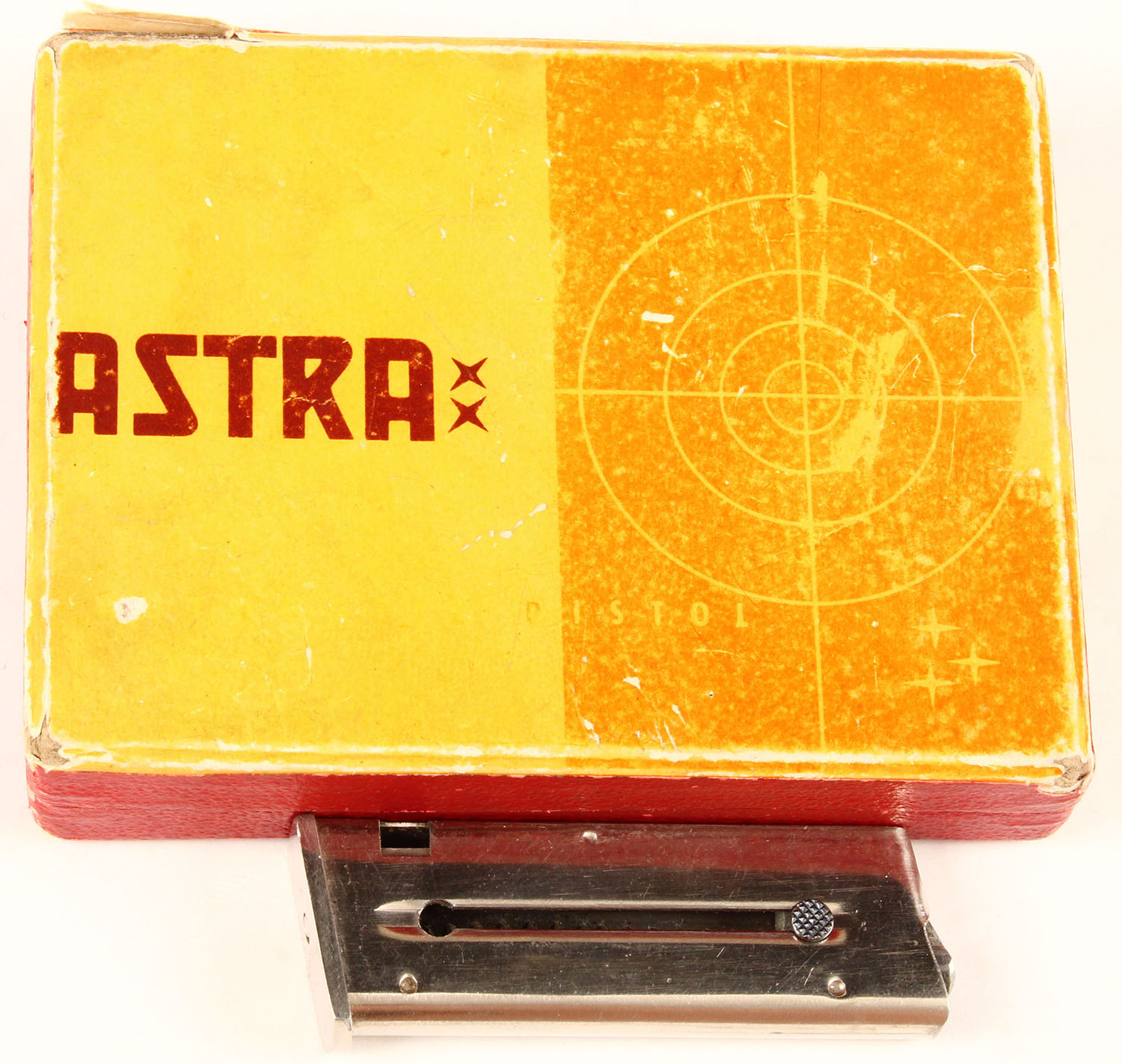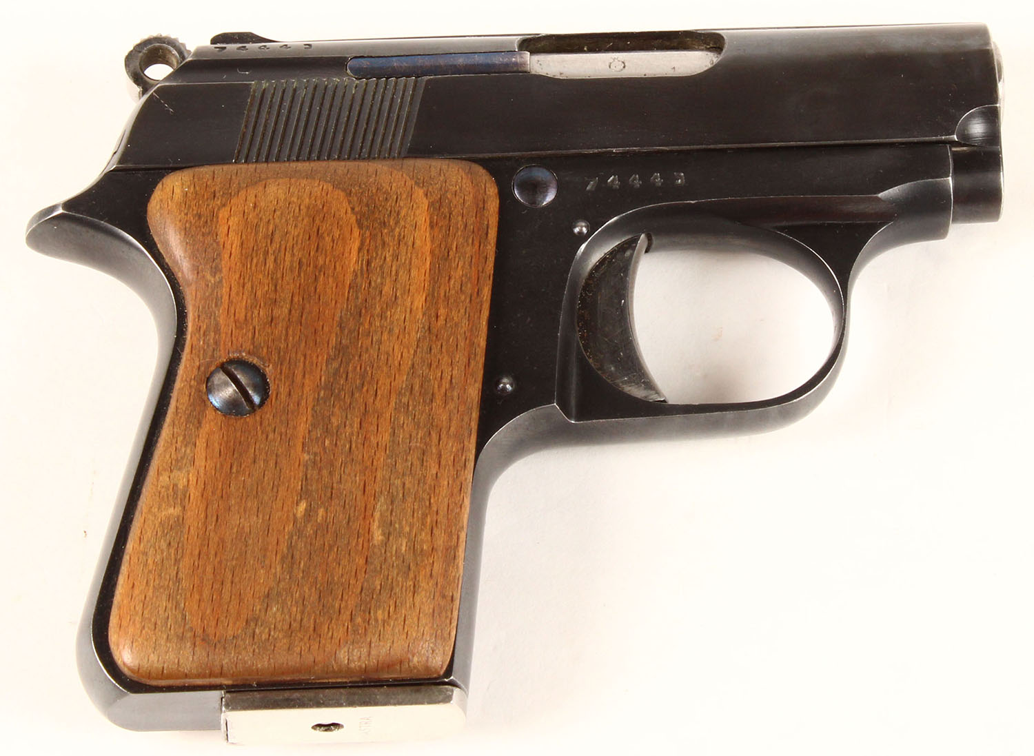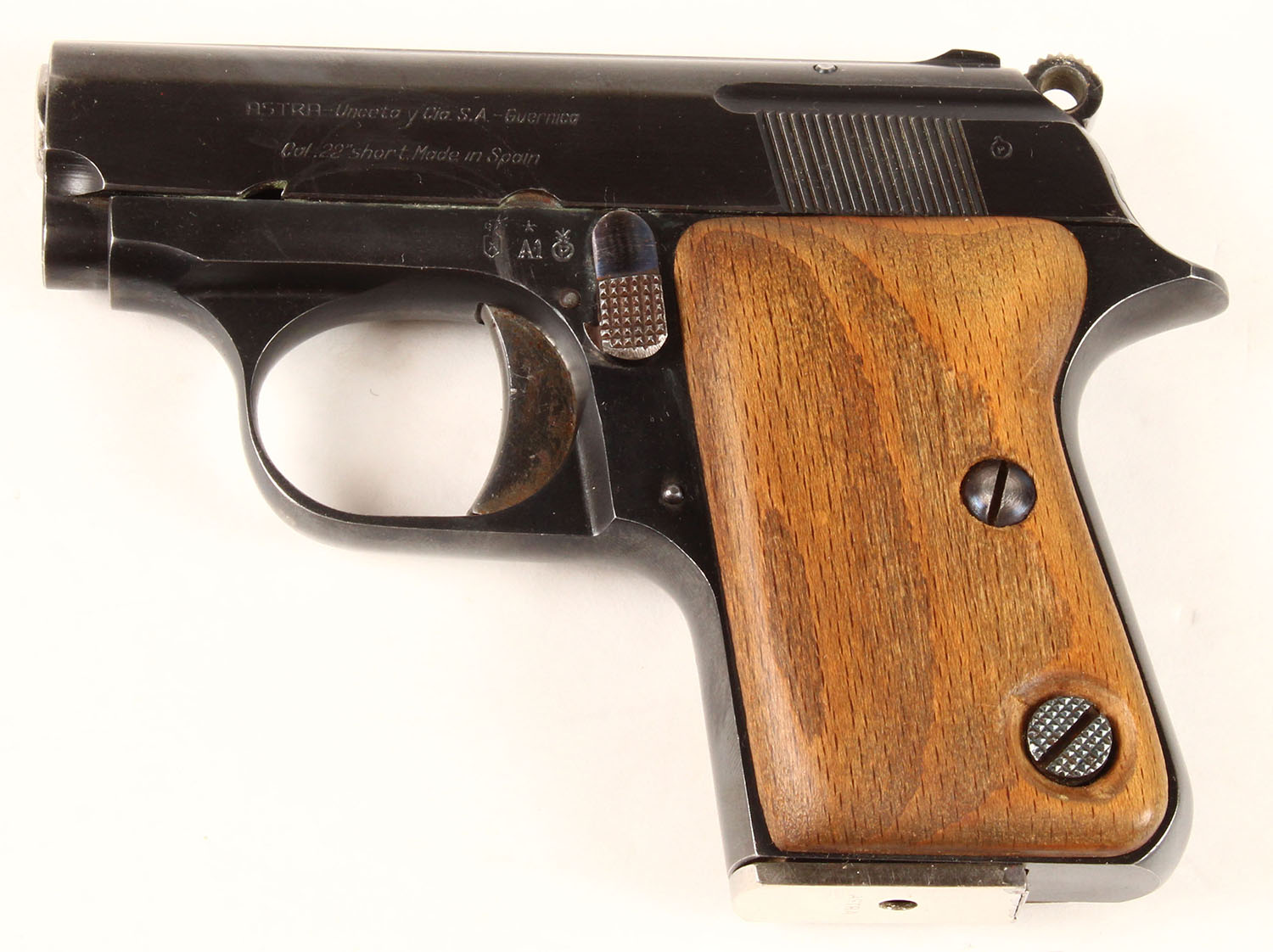 BOXED, Astra, Model 2000 ''Cub'', CAL: 22 SHORT, MFG: 1955, SN: 7444, Semi Auto Pistol, 2 1/4'' barrel. The wood grips are excellent. The metal blue finish rates 98% overall, with some light spotting on the frame. Bore is excellent. The slide holds a notch rear sight. Front sight has been ground down. Comes in original box, with owners manual & extra magazine. Box has light edge & corner wear. FFL or C&R Req. - Value: 250 to 500