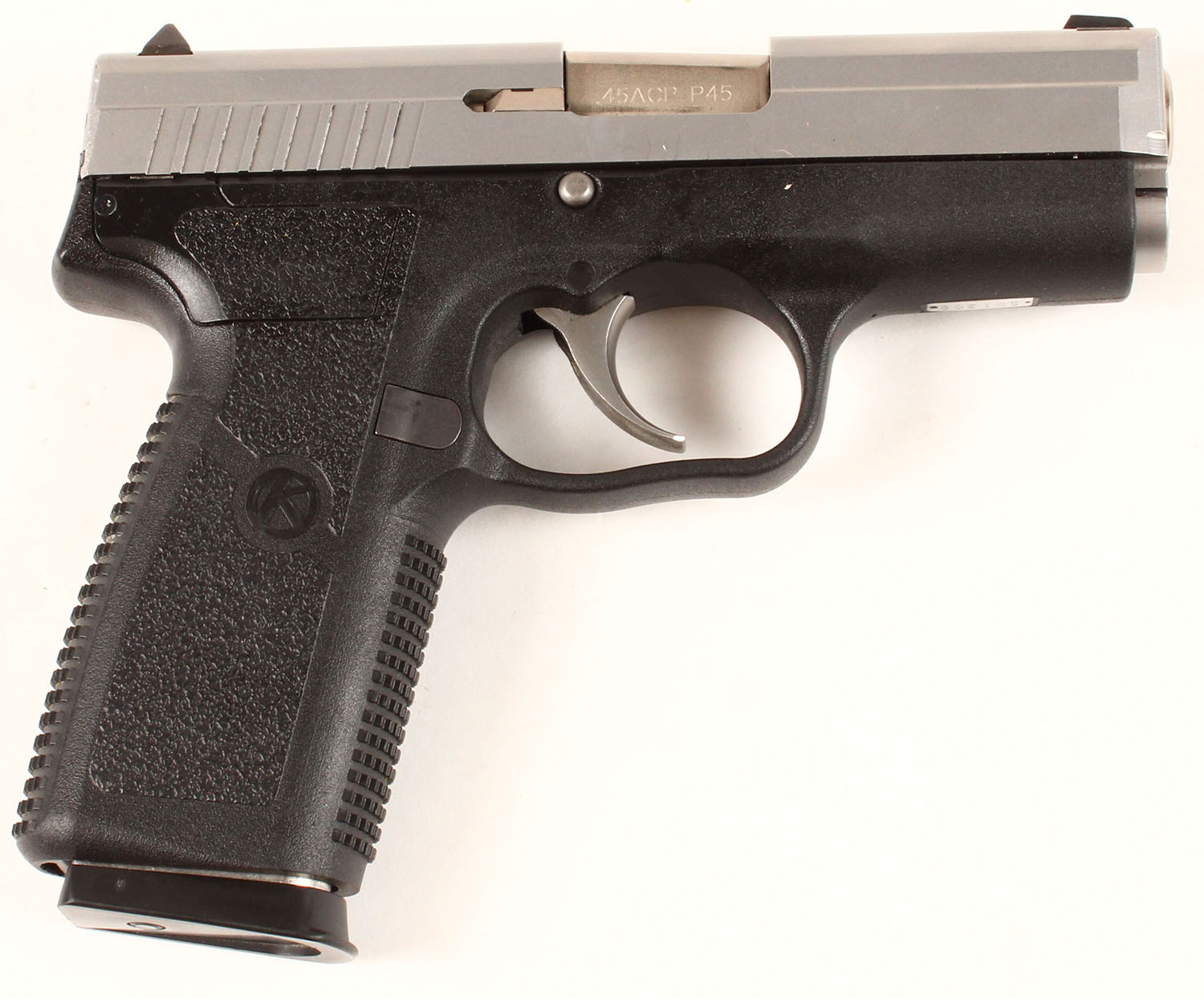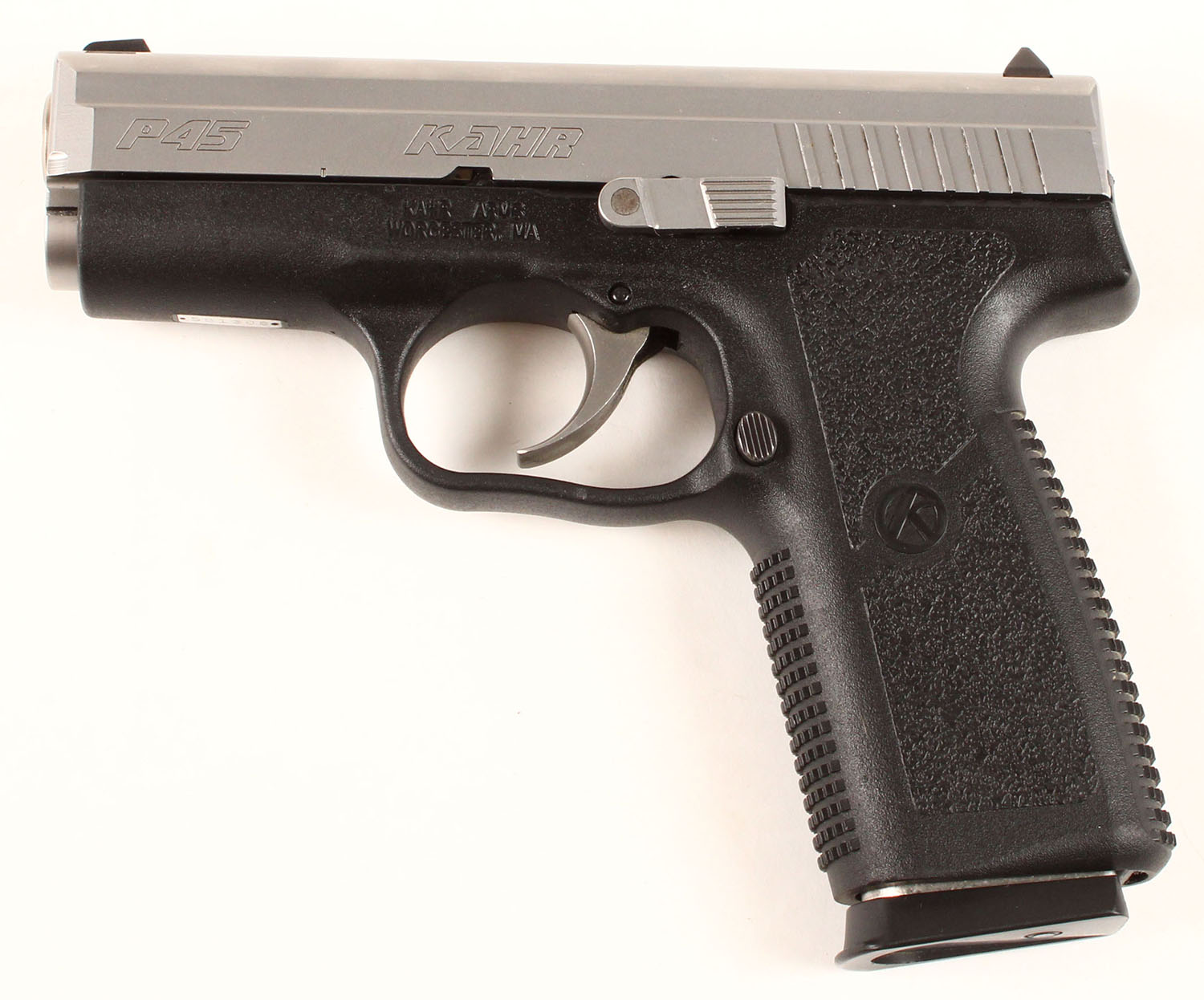 CASED Kahr Arms, Model P45, CAL: 45 ACP, MFG: Modern, SN: SB1308, Semi Auto, Double Action Only Pistol, 3 1/2'' barrel. The textured polymer grip frame is excellent, with light handling marks. The stainless steel finish on the slide is excellent. Bore is excellent. Dovetailed white bar rear sight & white dot front sight. A more economical alternative to many more expensive pistols, yet still a good quality gun in the popular caliber. Comes in its original hard case, with a second factory mag & operating manual. FFL Req. - Value: 400 to 800