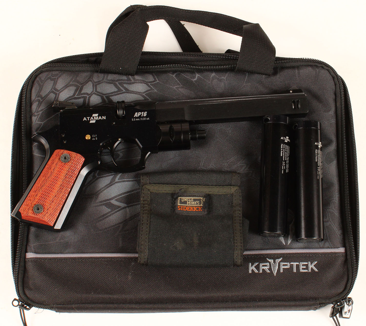 Russian gunsmiths stand behind every Ataman Airgun. Craftsmanship & excellence is evident in every aspect of this compact, PCP air pistol from its shrouded Lothar Walther barrel & ergonomic stock, to the adjustable trigger, & lightweight versatility. The Ataman AP16 Regulated .22 Cal. Pellet, Compact Air Pistol, SN:500349, features a stunning 4,350 psi (300 BAR) fill pressure, delivering more shooting time between fills. The lockwork trigger mechanism is a two stage, adjustable trigger, which allows the shooter complete freedom to set it up to their liking. The gun also sports a pressure regulator for ultimate shot-to-shot consistency. Whether you fill the aircraft grade aluminum cylinder to 4350 psi/300 BAR or to a lower pressure of your choice, the regulator ensures that the Ataman will make the best use of the available air supply. Comes with 2 extra 8 round mags, silencer & extra air cylinder in nylon zipper case. Grade: Excellent ++ NO FFL Req. - Value: 500 to 1000