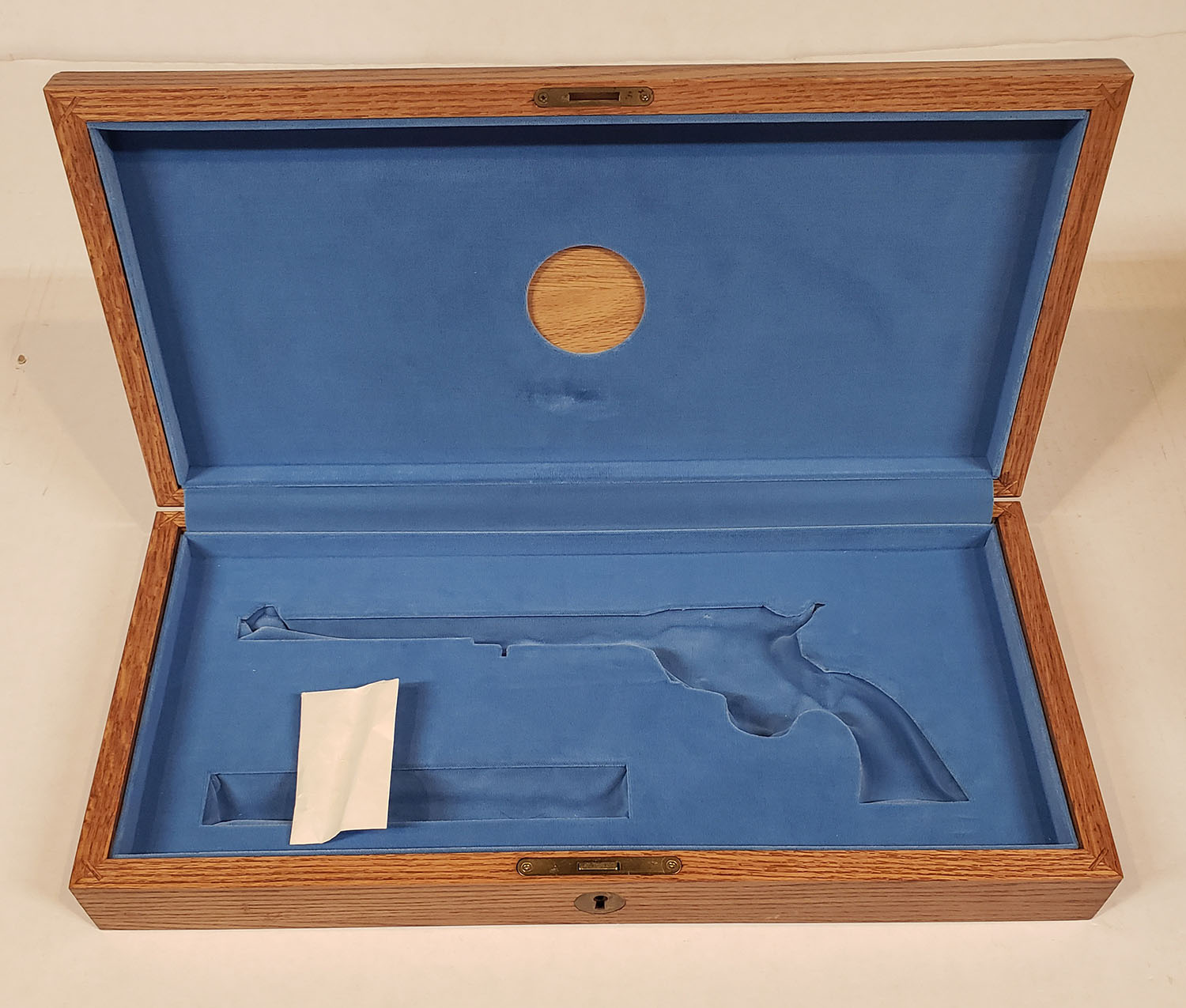 Colt 150 Year commemorative wood display case. MFG: 1986. The cases were produced to hold a Case Buntline revolver with a 10'' barrel. Case has ''1836- COLT-1986'' stamped on the top. Blue velvet interior is excellent. Missing the interior medallion. Has key in original envelope inside. Overall condition is excellent. - Value: 50 to 200