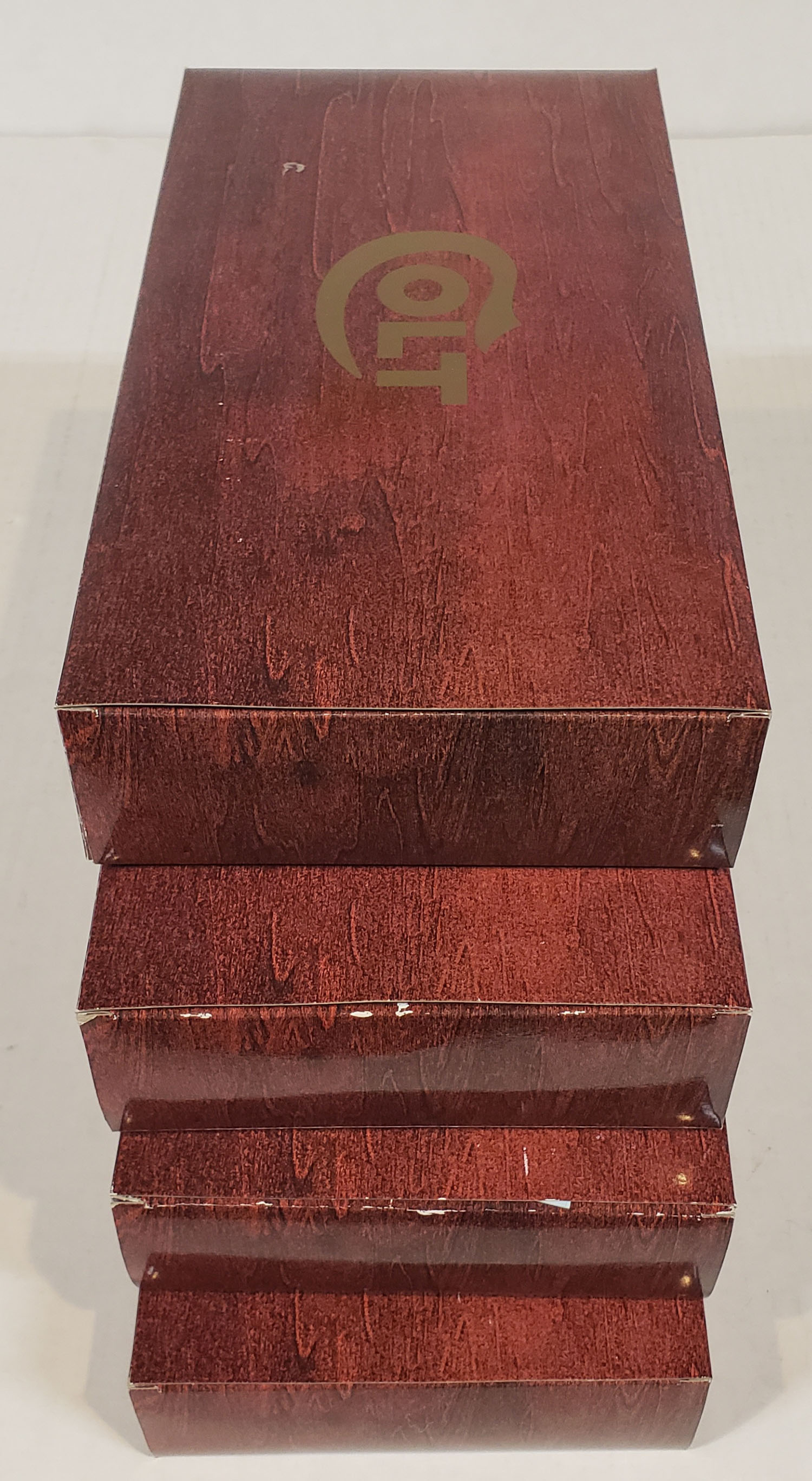 Lot of 4 Reproduction Colt wood grain boxes for Colt revolvers. Primarily used on the Snake series revolvers. Come with correct reproduction of foam interiors. Excellent overall condition. - Value: 40 to 100