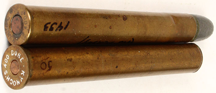 Lot of 2. (1) 400 Kynoch 3.18''. HS='' KYNOCH'S 400 BORE'', Shot Load, fiber wad .10'' below case mouth. (1) 400 x 3'' HS=''KYNOCH 400 P'', rn lead w/ copper tube. Grade: Very Good ++ - Value: 10 to 50
