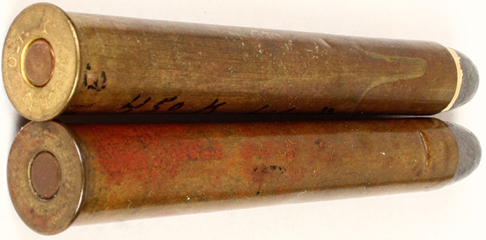 Lot of 2. 450 x 3.35'' HS=''KYNOCH C 450 L''. 1 rn paper patch lead w/ copper tube, 1 rn lead. Light cordite for black powder rifles. Grade: Very Good ++ - Value: 10 to 40