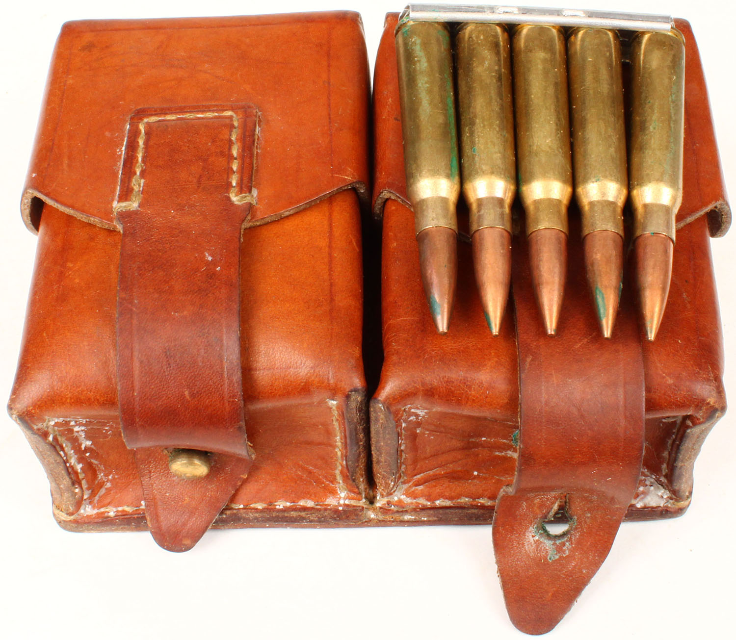 Leather ammo pouch, filled with five 5 Rd. clips of 7.5 French, one loose Rd. of 7.5 French & 12 Rds. of .303 British, all 7.5 French is PPU & the .303 is a unmarked H/S, ammo is very good with small amounts of green corrosion on most Rds.. Grade: Very Good + - Value: 20 to 100