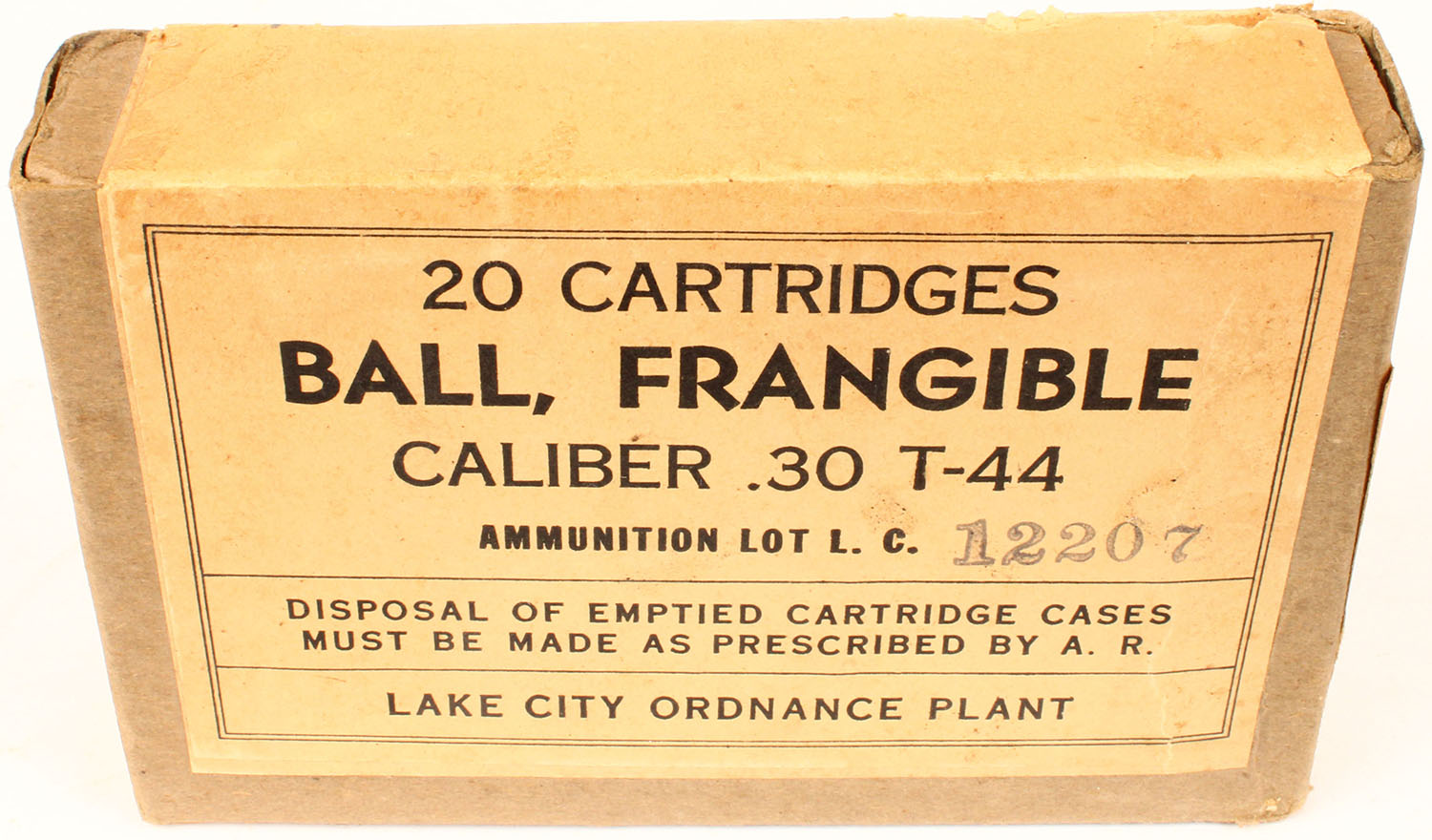 Lake City, .30 T-44 Ball Frangible, Lot L. C. 12207, 1pc, FULL & SEALED, brown box with buff label & black print, box is solid with light age soiling, light rub marks, & light handling wear. Grade: Excellent - Value: 20 to 60