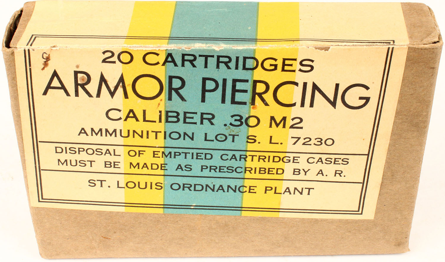 ST. Louis, .30 M2 Armor Piercing, Lot S. L. 7230, 1pc, Full, buff box with buff/orange/blue label & black print, box is solid with small stains & light rub wear, ammo ranges from very good to good. Grade: Excellent ++ - Value: 20 to 60