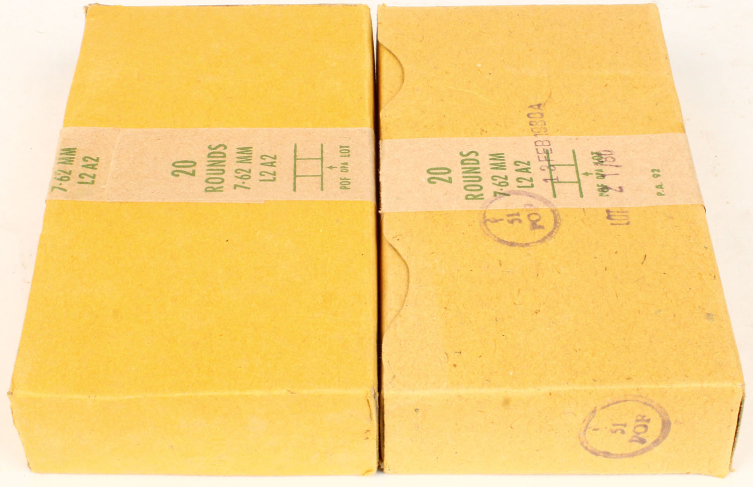 Lot of two, POF (Pakistan Ordnance Factories), 7.62mm L2 A2, 1980 dated, 1pc, Both Full, yellow box with buff label & green print, box's are solid with light rub wear, ammo is very good. Grade: Excellent - Value: 30 to 60