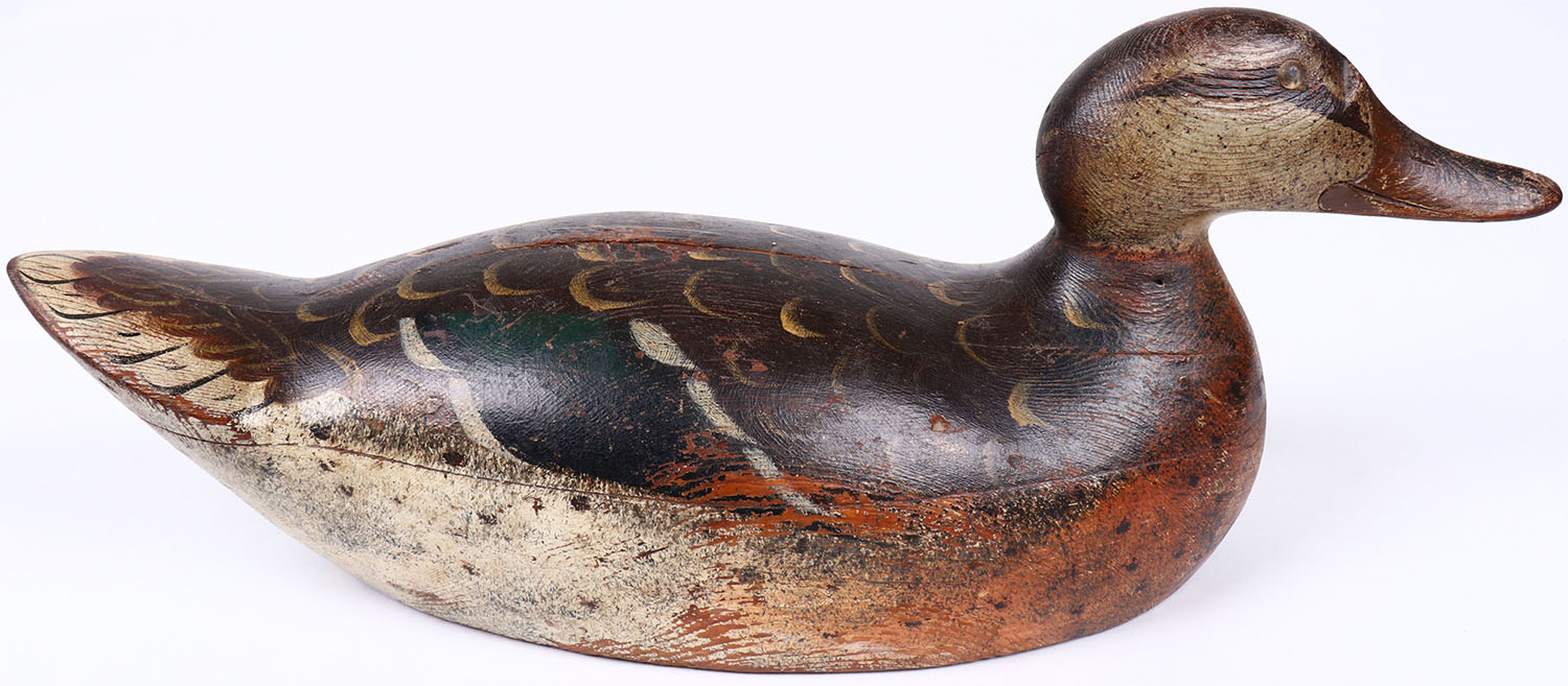 Mallard Hen, by Mason Decoy Company, Detroit, MI,1896-1924 premier grade, glass eyes, hollow wood, original paint, has age crack on back. Grade: Excellent - Value: 500 to 1000