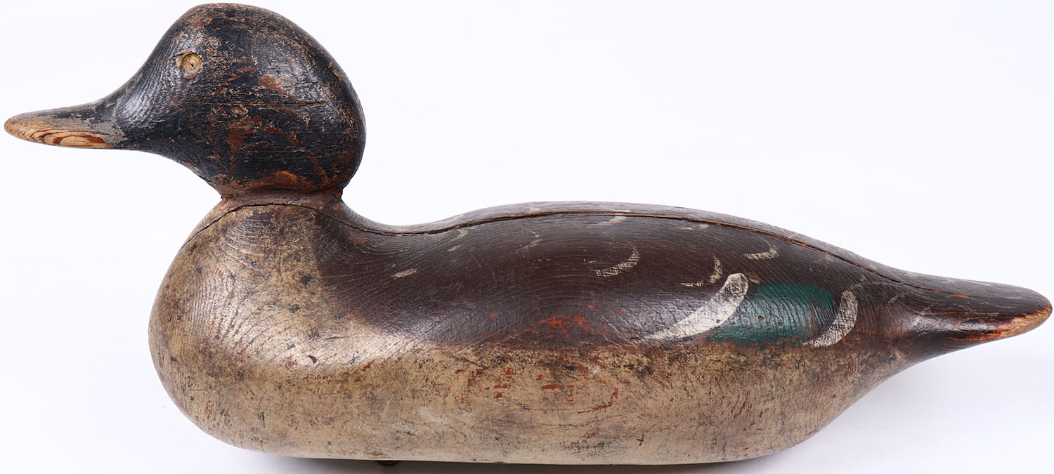 Mallard Body / Head Unknown Species by Mason Decoy Company or Hays Decoy Factory, Detroit, MI,1896-1924 standard grade, no eyes, solid wood, has age cracks on back and under neck, original paint, branded JH on bottom. Grade: Excellent - Value: 50 to 200