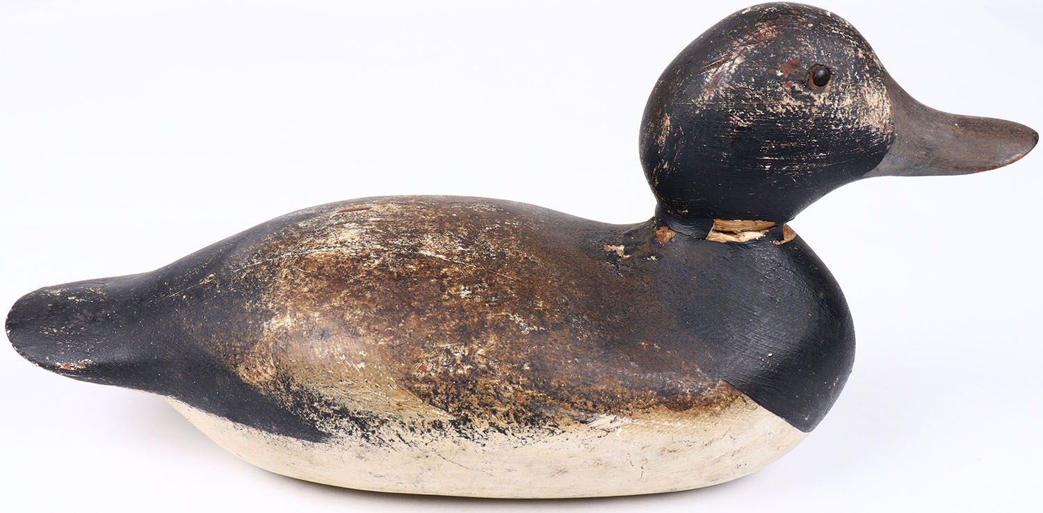 Bluebill Drake by Mason Decoy Company, Detroit, MI,1896-1924, standard grade, tack eyes, original paint with some touch up on bottom, structurally excellent. Grade: Excellent - Value: 50 to 150