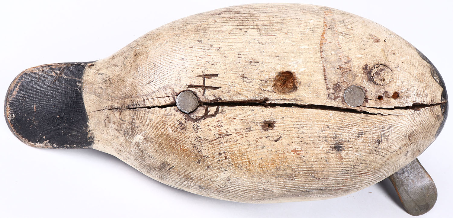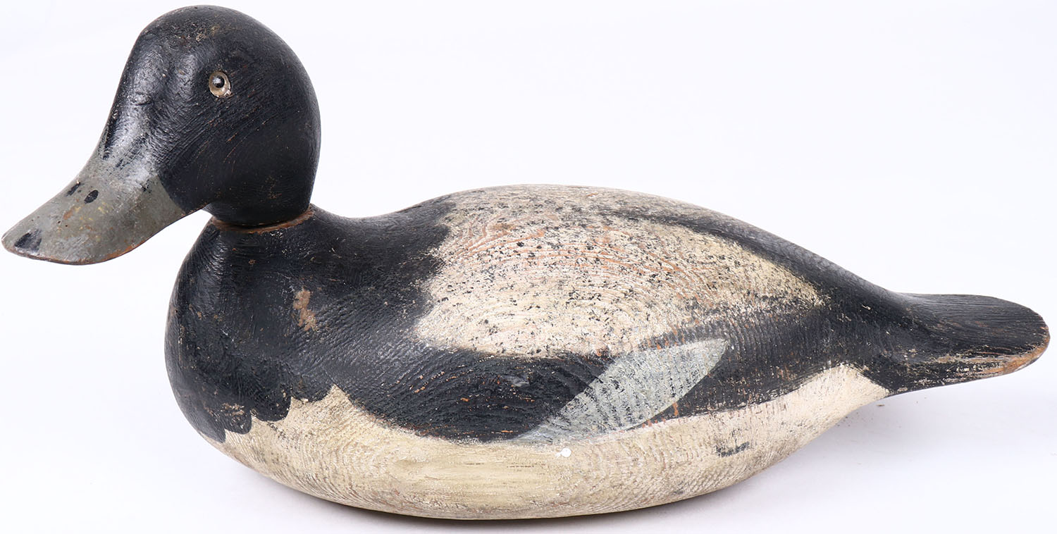 Bluebill Drake by Mason Decoy Company or Hays Decoy Company, standard grade, glass eyes, solid wood, original paint, has age cracks on bottom, head is loose. Grade: Excellent - Value: 50 to 150