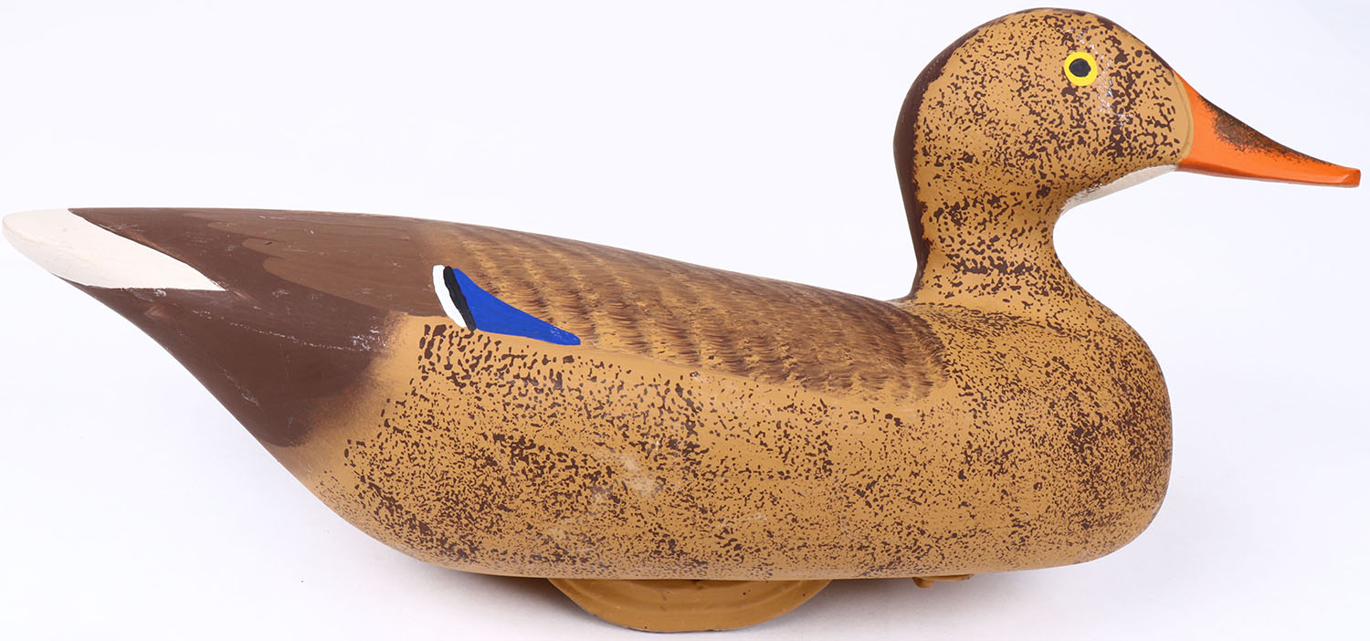 Mallard Hen by Dave Wooten, painted eyes, solid wood, repainted, signed on bottom, structurally excellent. Grade: MNT - Value: 30 to 60