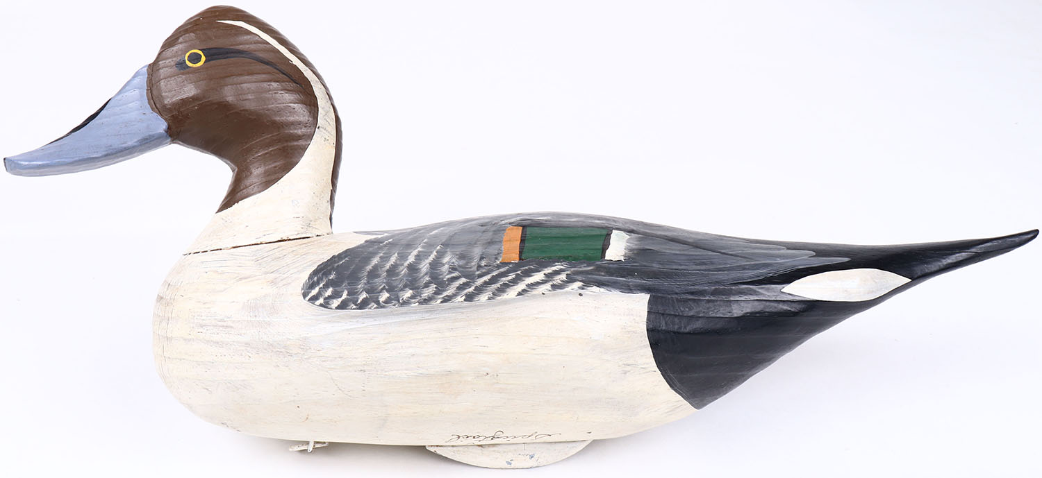 Pintail Drake by Charles Jobes, Havre de Grace, MD, painted eyes, solid wood, repainted, signed on bottom, structurally excellent. Grade: Excellent + - Value: 50 to 100