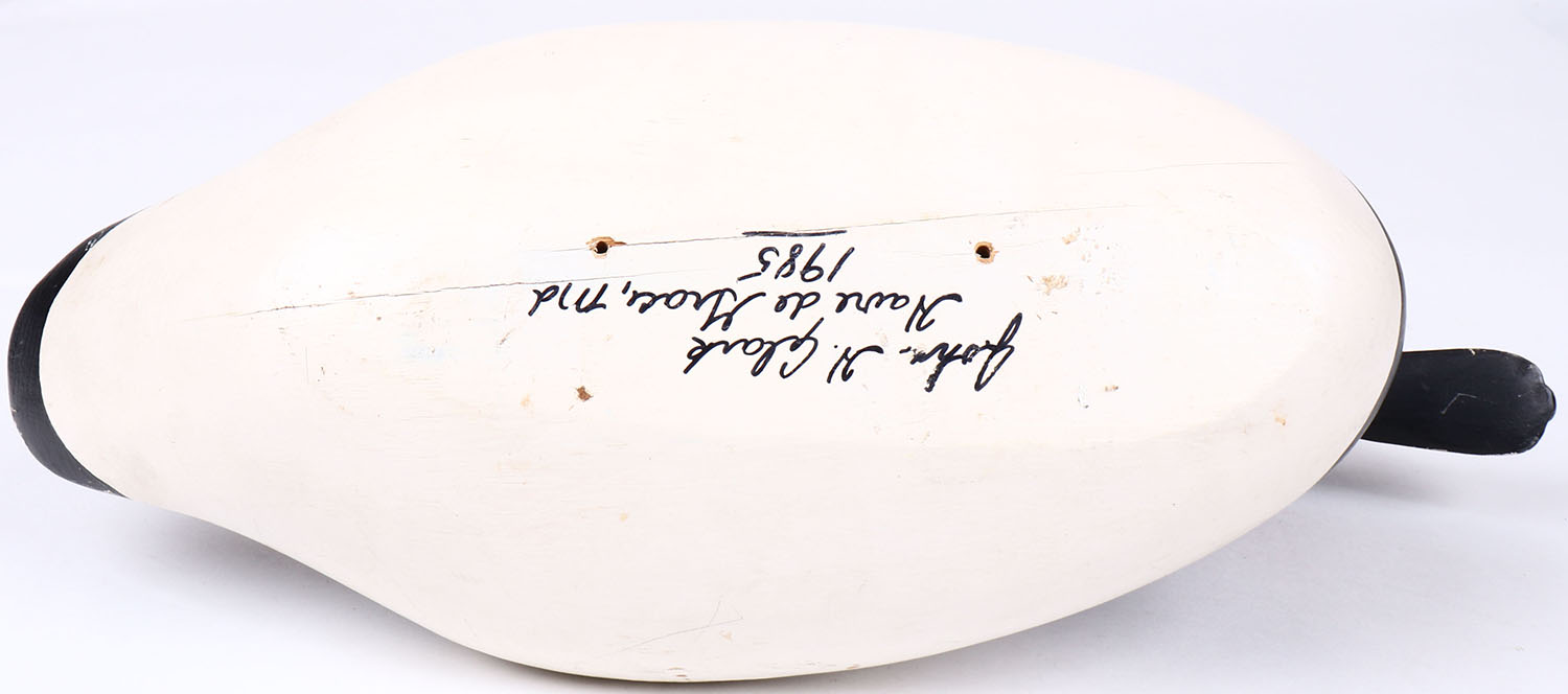 Canvasback Drake by John H Clark, (1985), Havre de Grace, MD, painted eyes, solid wood, structurally excellent, signed on bottom, original paint. Grade: Excellent - Value: 40 to 80