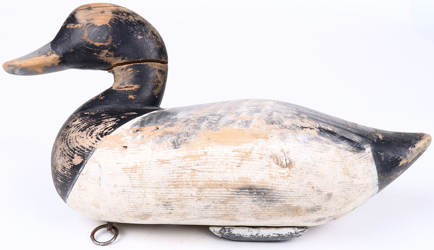 Bluebill Drake by unknown maker, MD, painted eyes, solid wood, has hairline age crack around neck, original paint with typical wear. Grade: Very Good ++ - Value: 30 to 60