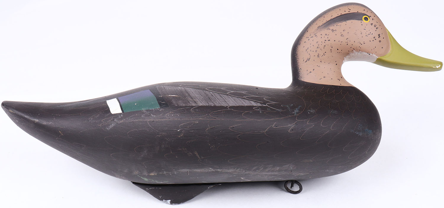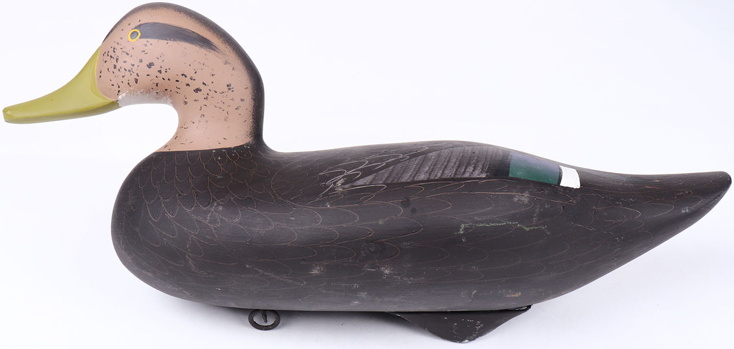 Black Duck by Patrick ''Pat'' Vincenti, Churchville, MD, painted eyes, solid wood, original paint with comb painting, signed on bottom, structurally excellent. Grade: MINT - Value: 30 to 60