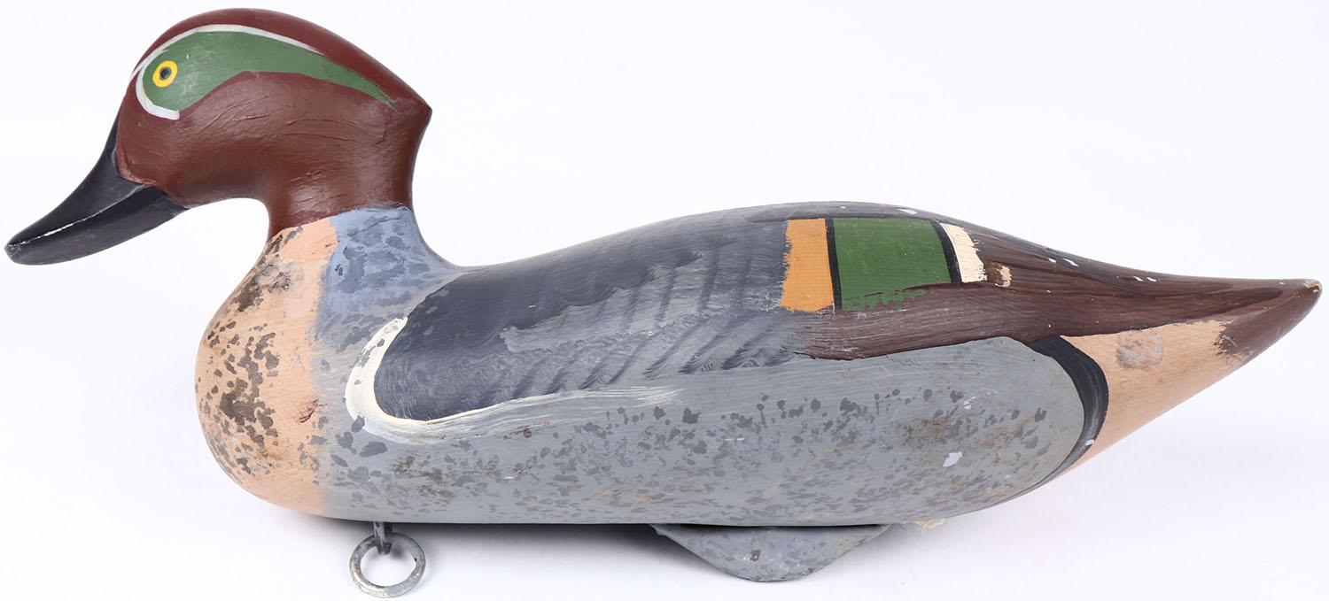 Green Wing Teal Drake by Capt. Harry Jobes Havre de Grace, MD, painted eyes, solid wood, original paint, has crack on bottom back, signed on bottom. Grade: Very Good ++ - Value: 40 to 80