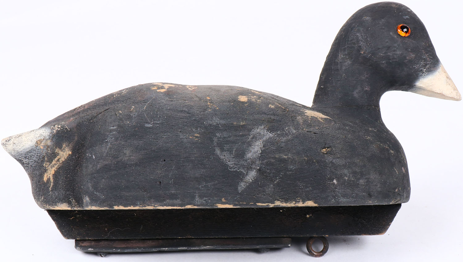 Coot by Herter's Inc. glass eyes, hollow wood, original paint with typical wear, structurally excellent. Grade: Excellent - Value: 30 to 60